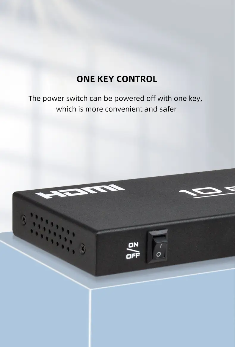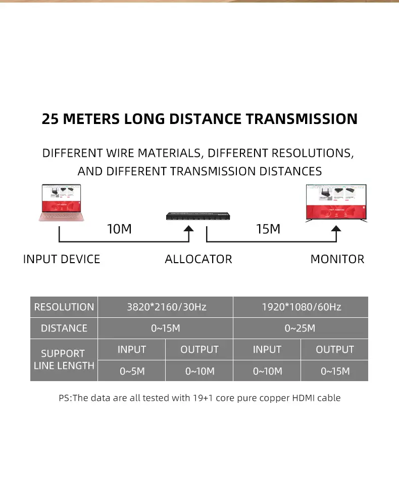 * Stable Long Distance Transmission: With the 19+1 AWG26 standard HDMl cables, 1 in 10 out HDMI splitter supports max input HDMl cable length up to 10m(32.8ft) and output HDMl cable up to 15m(49.2ft), provides max stable transmission distance up to 25m(82ft). {HDMI cable NOT included}
