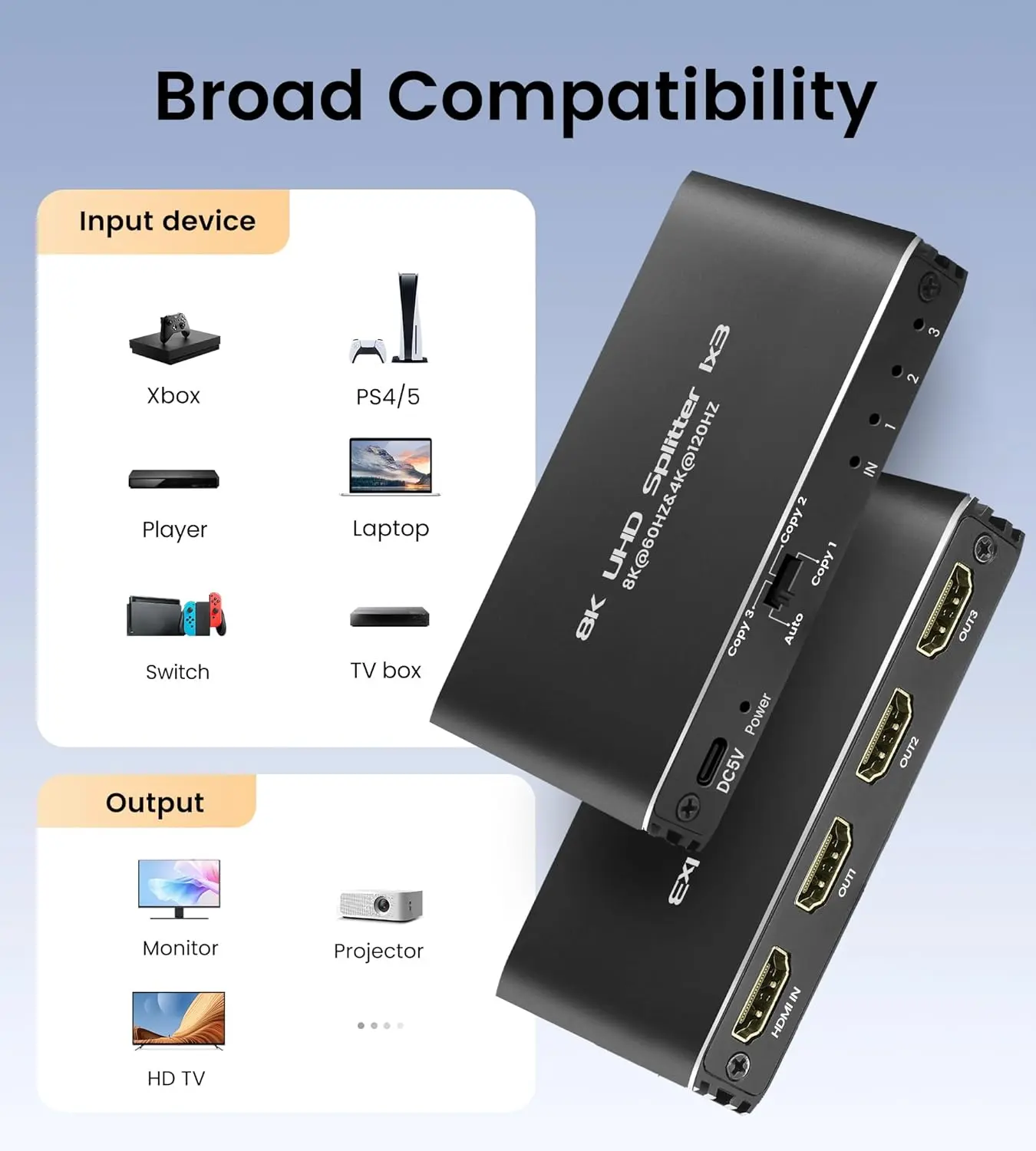 * [Widely Compatibility] This 8K HDMI Splitter 1x3 is compatible with most devices that have a standard HDMI interface. HDMI Input port support connect PS5/4/3, Xbox Series X/S, Gaming Console, DVD Player, Blu-ray Player, etc; HDMI output port support connect HD TVs, projector, monitors etc