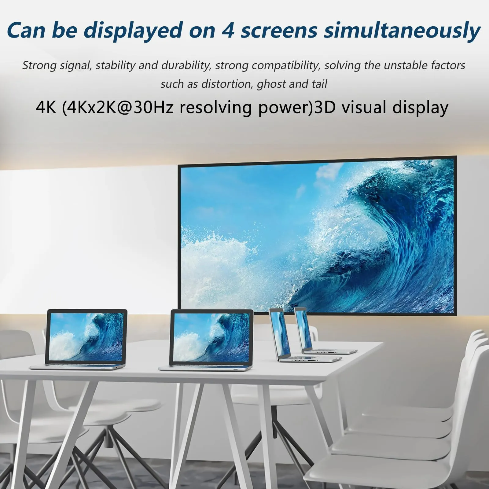 ❶:The HDMI Splitter 1 in 4 out distributes audio signals from a single HDMI input source to 4 display terminals (4 display terminals displaying the same picture)【Warm Reminder】NOT HDMI SWITCH, does NOT support 4 input 1 out.