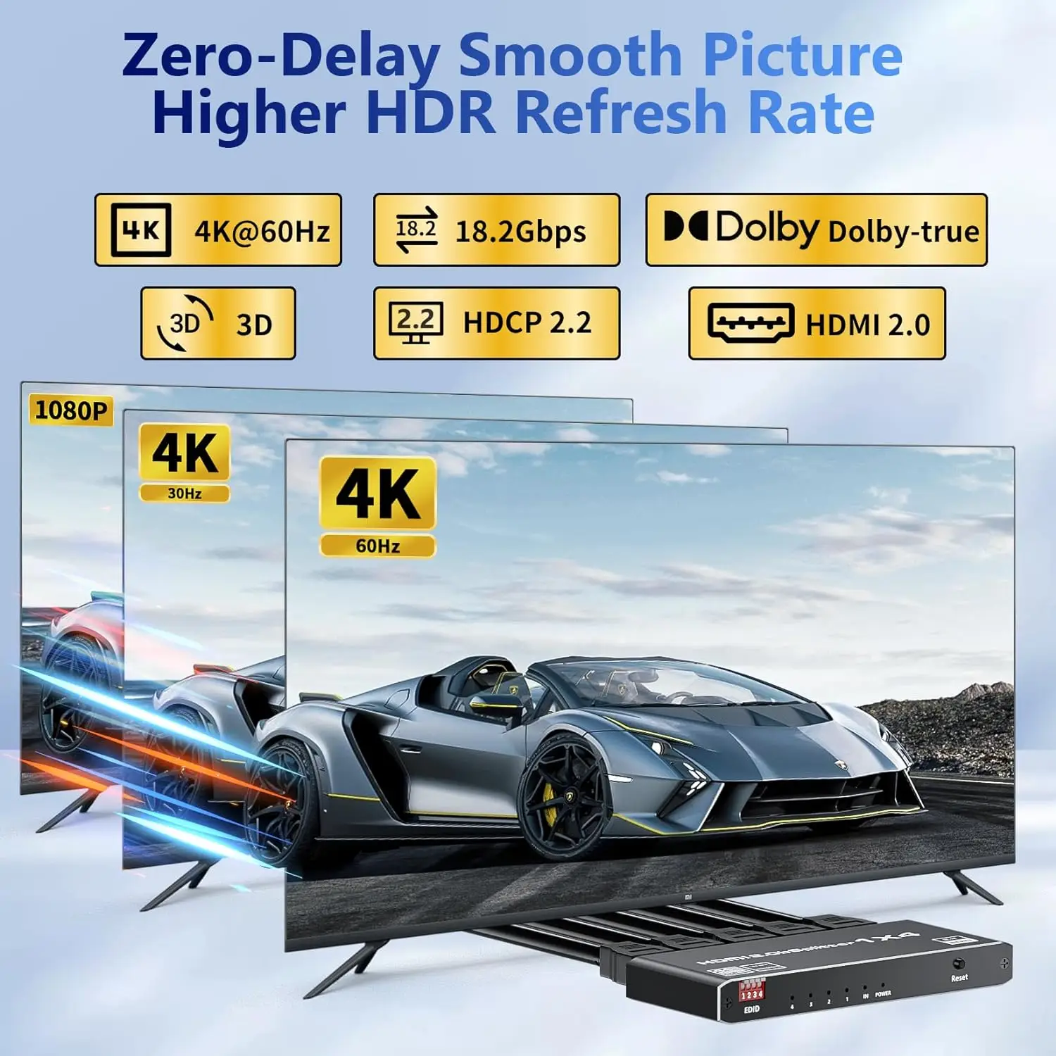 * 4K HDR 8:8:8: HDMI splitter 4K mirrors four 4K@60Hz (backward also compatible) displays without any loss of video and audio. Also supports multichannel audio streams. Also support DTS-HD/Dolby-trueHD/DTS/Dolby-AC3/DSD Vision. Delivering breathtaking visuals and audio to you