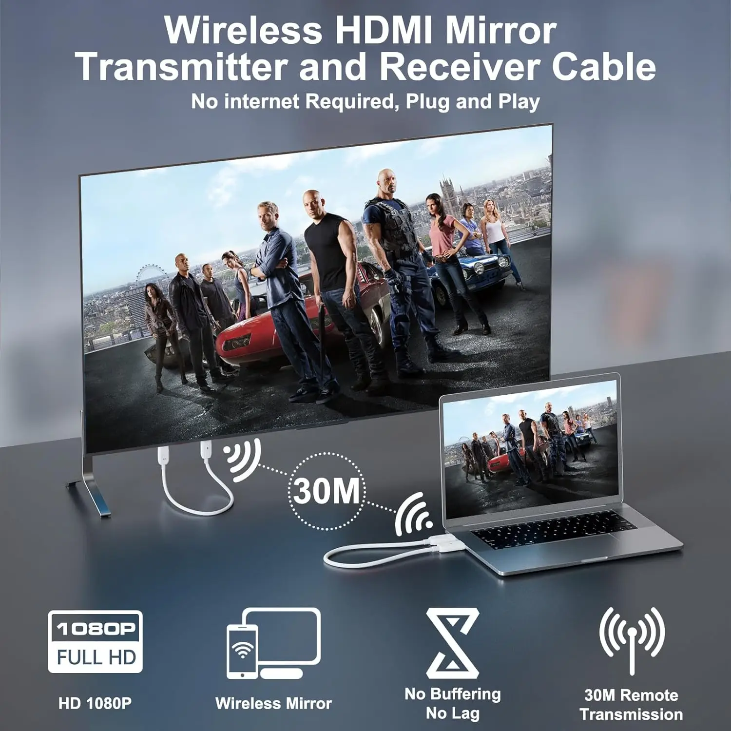 ⚡️ 【98FT/30M Range Wireless Transmission】The wireless HDMI transmitter and receiver have wireless transmission up to 98FT/30M. The latency is as low as 60ms. It is not recommended to use wireless HDMI extenders through walls because the transmission efficiency and range of the wireless HDMI transmitter and receiver will be reduced. Supports OTA online upgrade version, worry-free compatibility with new devices and new systems. This Wireless HD Extender 1080P is not recommended for gaming use.