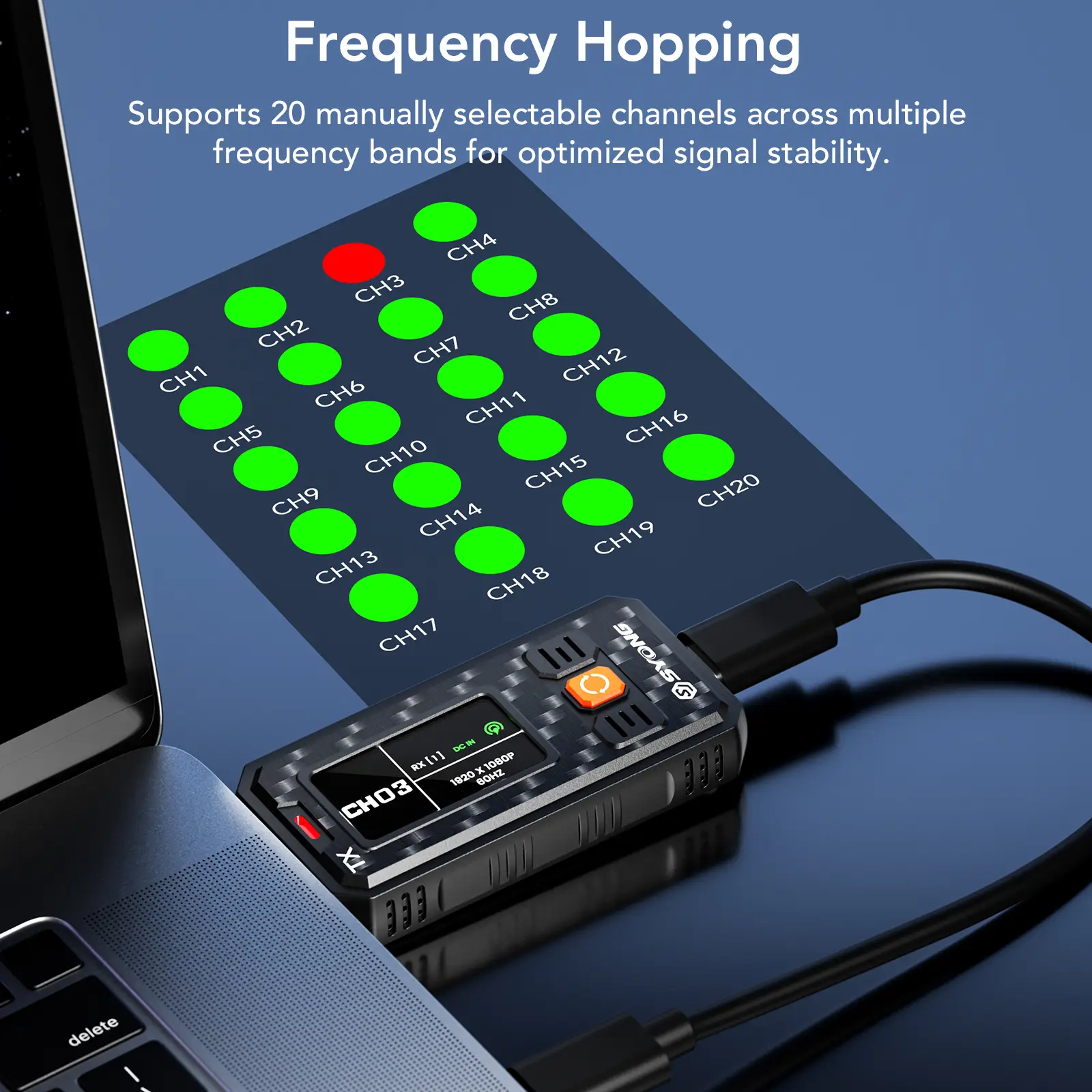20 Adjustable Channels + LCD Display: LCD shows signal strength/interference per channel; manually select the best channel on TX or RX, and the other side auto-syncs for stable transmission.