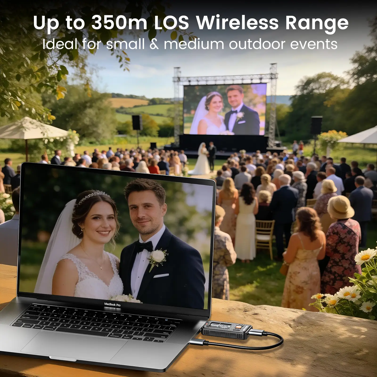 This mini wireless HDMI transmitter and receiver supports up to 1150ft/350m range (open field), dual-band 2.4G/5G with 20 selectable channels (CH01–CH20), and HDMI input/output up to 1080P@60Hz (backward compatible), with 1TX to 4RX pairing for multi-display use. Featuring a color LCD for real-time monitoring and USB-C 5V/2A power, it’s ideal for portable setups such as meetings, presentations, training, exhibitions, and temporary multi-screen deployment.