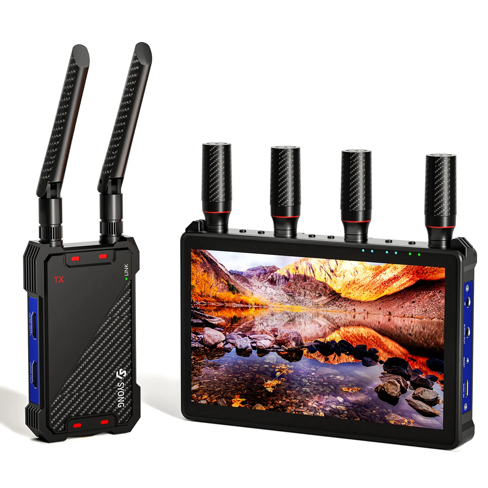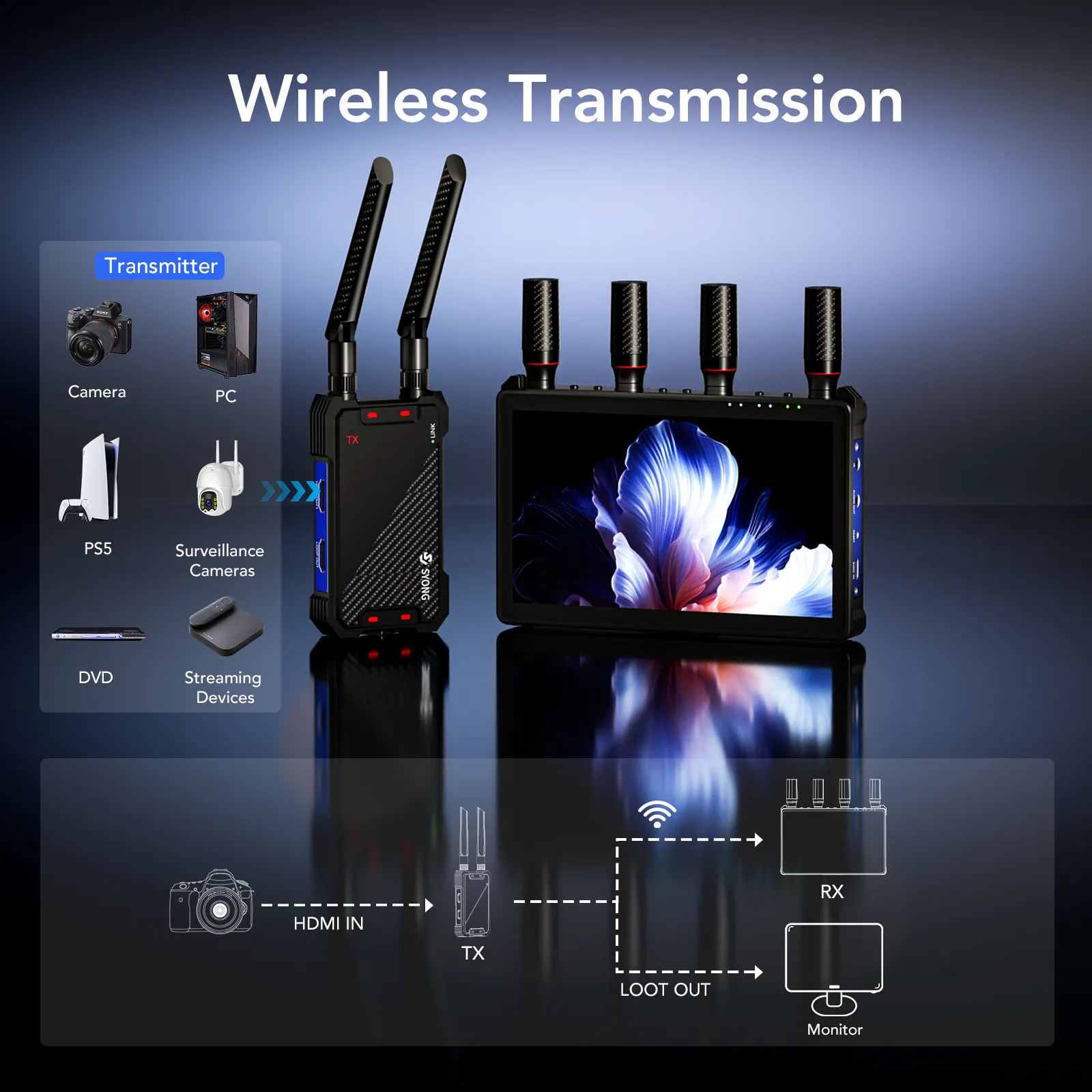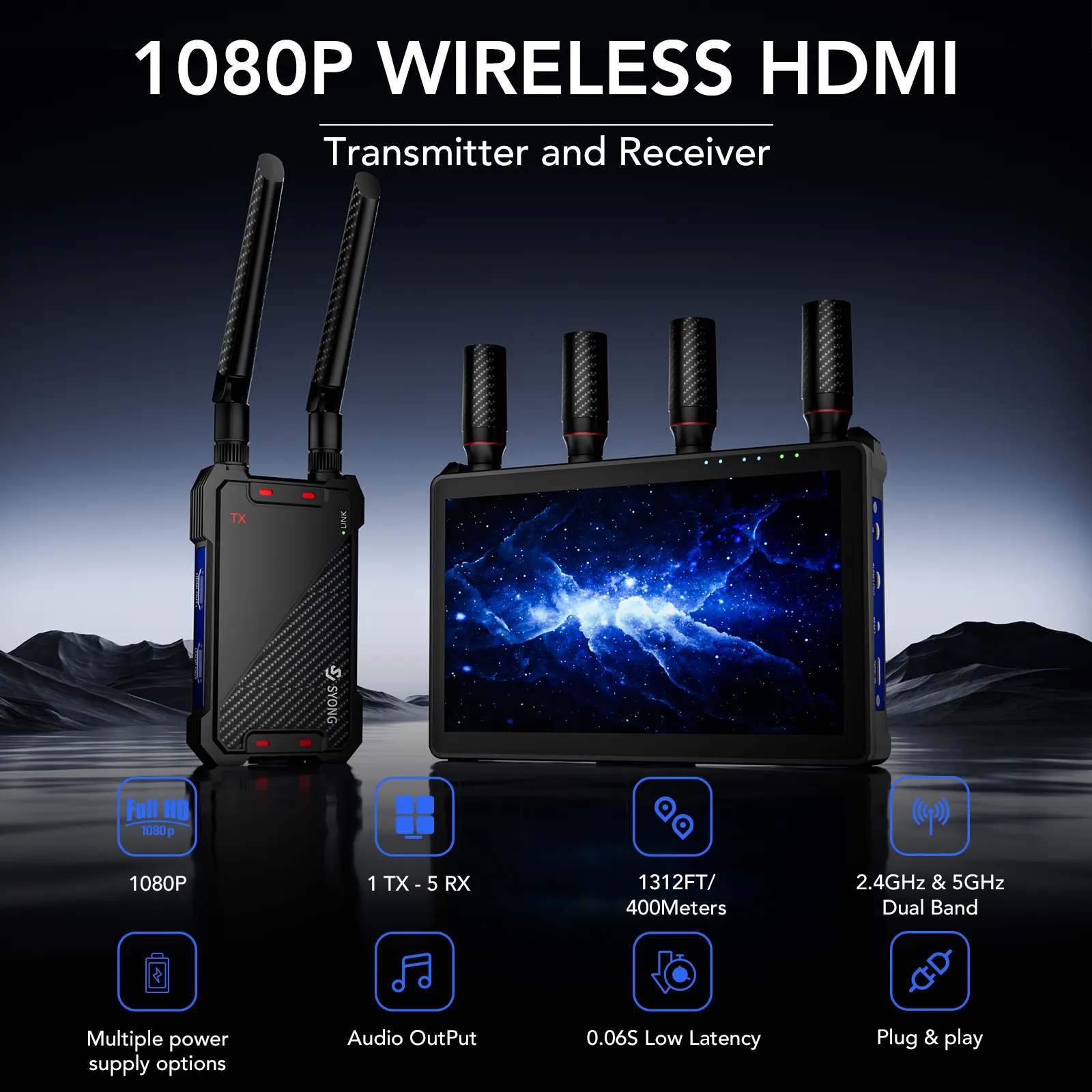 This SYONG wireless HDMI video transmission system supports plug & play 1080P@60Hz with HDCP 1.4 and 0.05s low latency, and delivers up to 1300ft range in open, interference-free areas via 2.4G/5G dual antennas and point-to-point transmission (walls/metal/bricks/glass may reduce range). It includes IR remote control (control the HDMI source from the receiver/TV side), TX loop-out for a local monitor, and dual HDMI output on the receiver to connect two screens simultaneously. The receiver features a built-in 7-inch LCD screen and portable battery compatibility, ideal for outdoor use, home entertainment, livestreaming, and professional presentations.