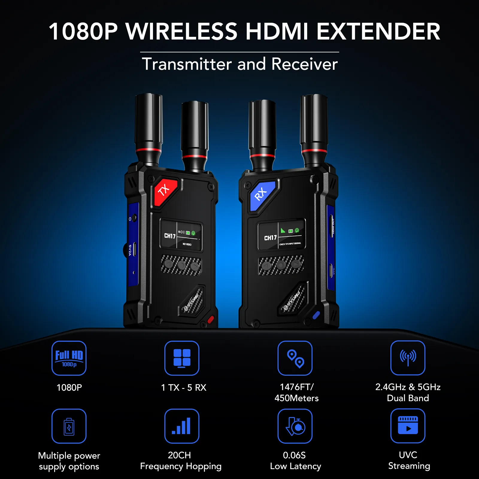 1080P 450M/1500ft WIRELESS HDMI™ Transmitter and Receiver for SLR Camera support NP-F Battery, UVC and 1-to-5