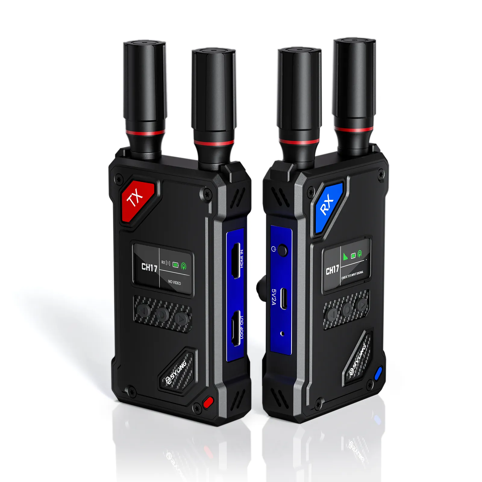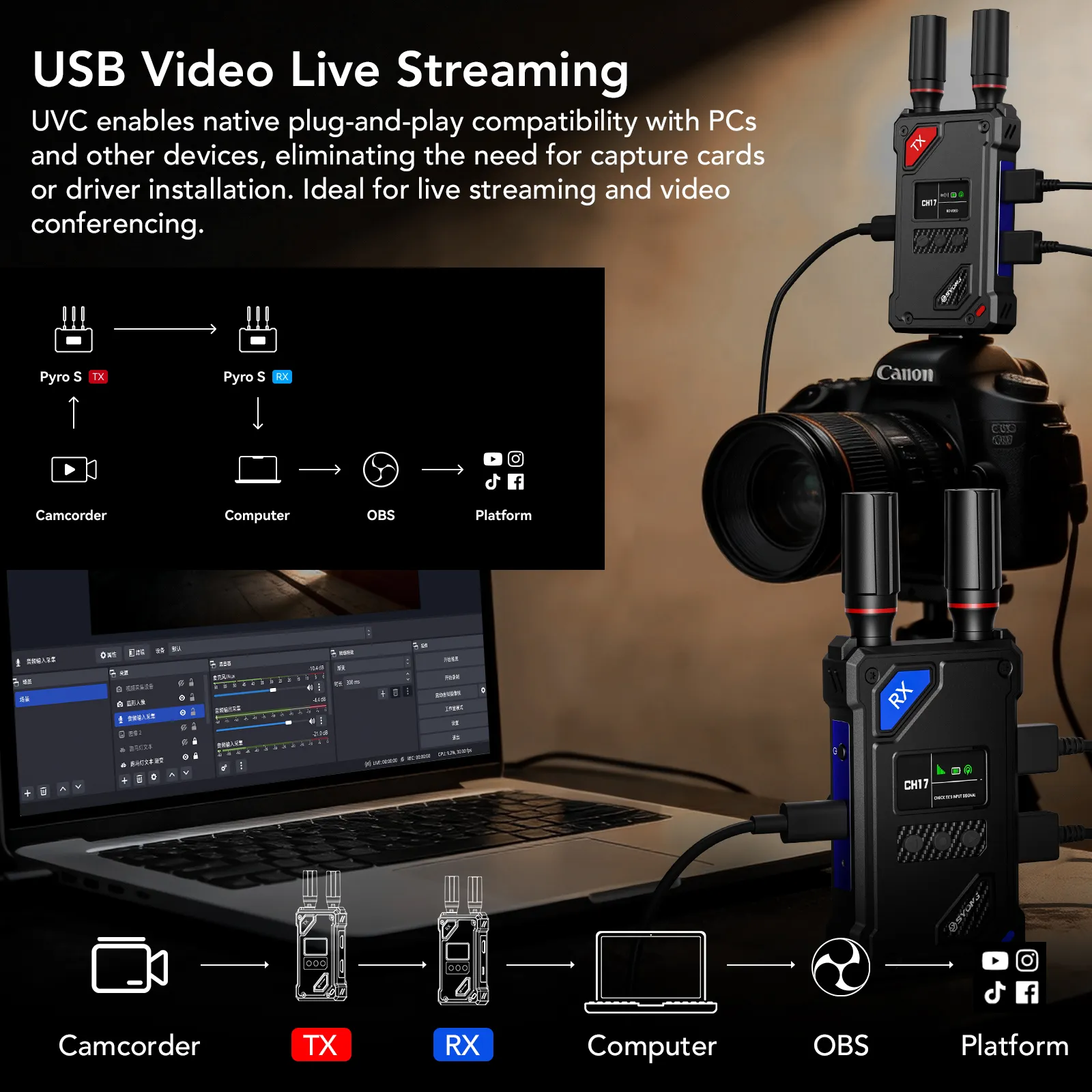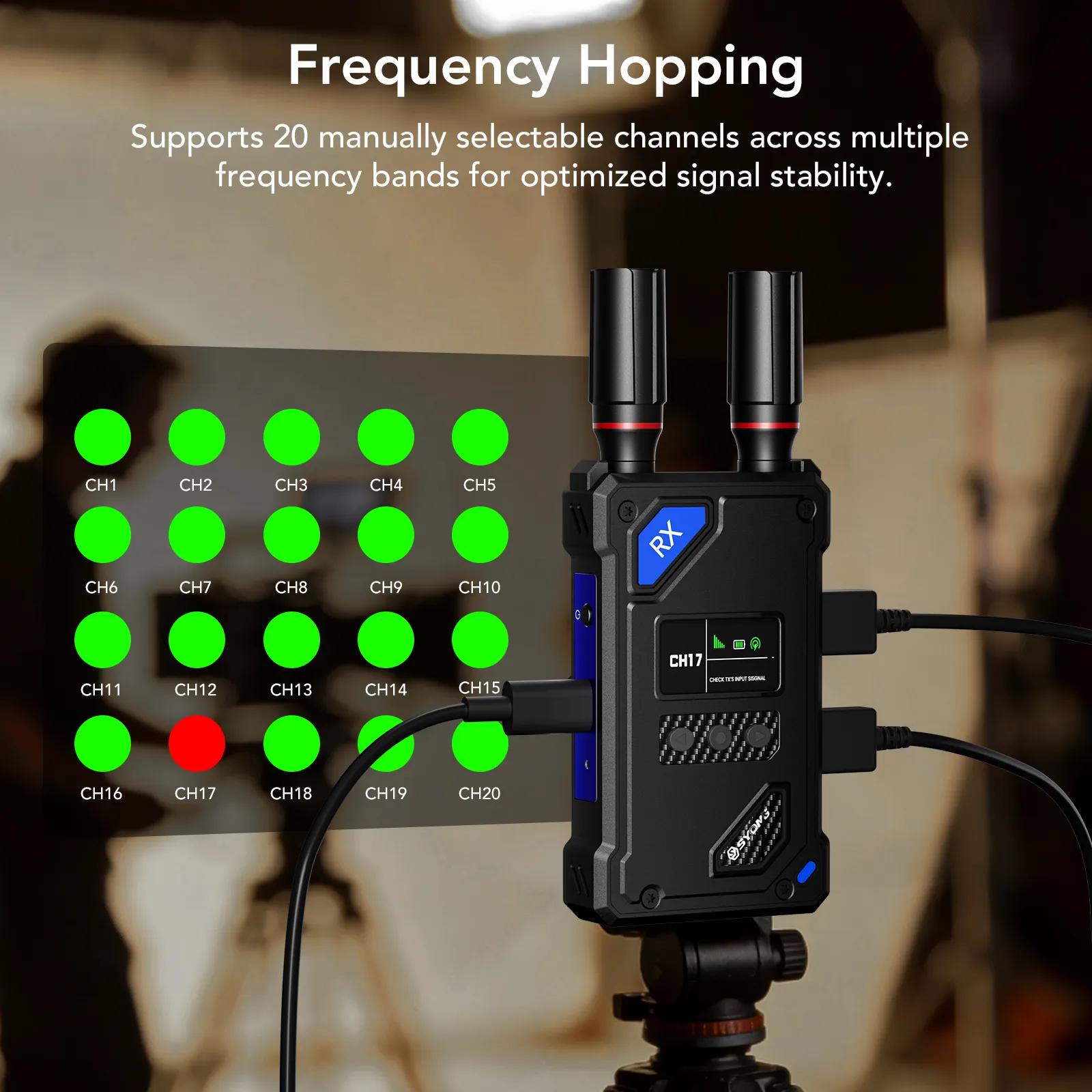 Vrriis Wireless Video Transmission System is a plug-and-play wireless HDMI kit designed for reliable long-range video delivery and flexible monitoring. It provides ultra-low 0.05s latency and up to 1500ft line-of-sight range in open, interference-free environments via dual-antenna 2.4G/5G point-to-point transmission (walls, metal, bricks, or glass may reduce range). With 20 adjustable channels and an LCD showing signal strength/interference, you can quickly choose the best channel on either TX or RX while the other end auto-syncs. The receiver supports USB-C UVC output for direct live streaming to a computer (e.g., OBS) using the included USB-C cable—no capture card required—while the transmitter offers HDMI loop-out for local monitoring. It supports HDCP 1.4 and up to 1080P@60Hz, offers multiple power options (NP-F F970/F750/F550 or 5V2A USB-C/adapters, batteries not included), and supports 1TX to up to 5RX (more receivers will reduce transmission distance).