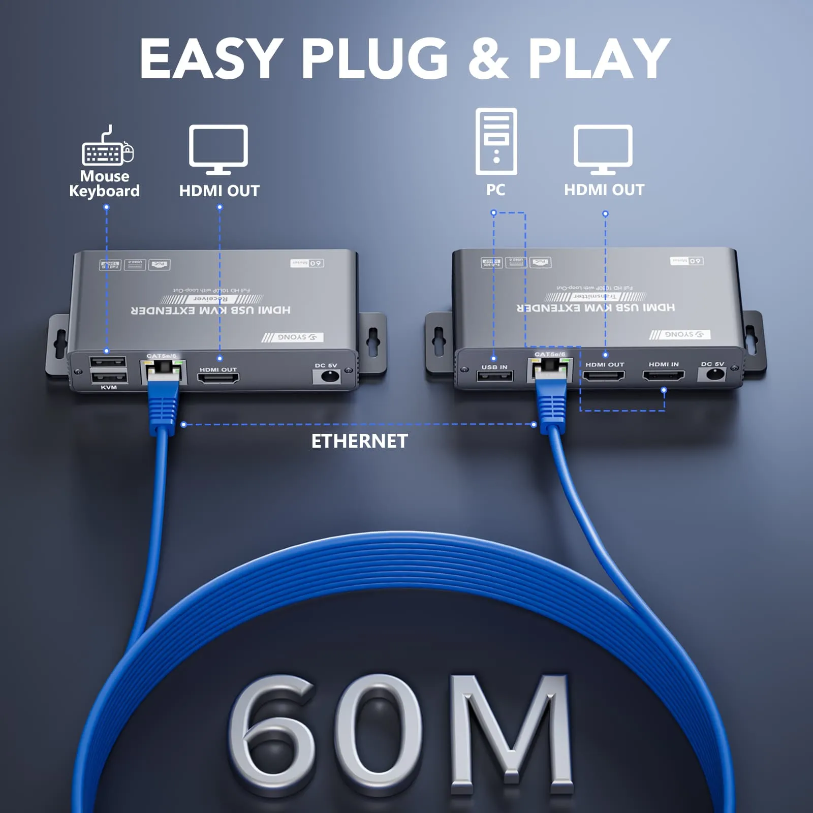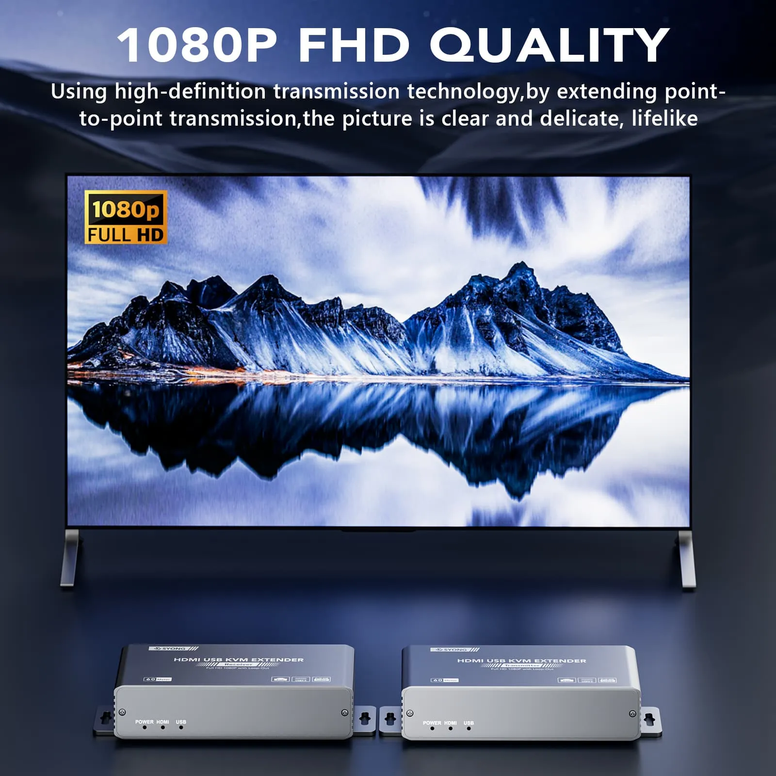 * [ Loop-out Function] HDMI KVM USB extender features a loop-out function allows technicians to monitor the display performance of the computer and perform equipment adjustments at any time without having to travel back and forth between locations. Even if long-distance transmission experiences interference or errors, the loop-out display ensures that local display remains unaffected, significantly enhancing the efficiency of product deployment.