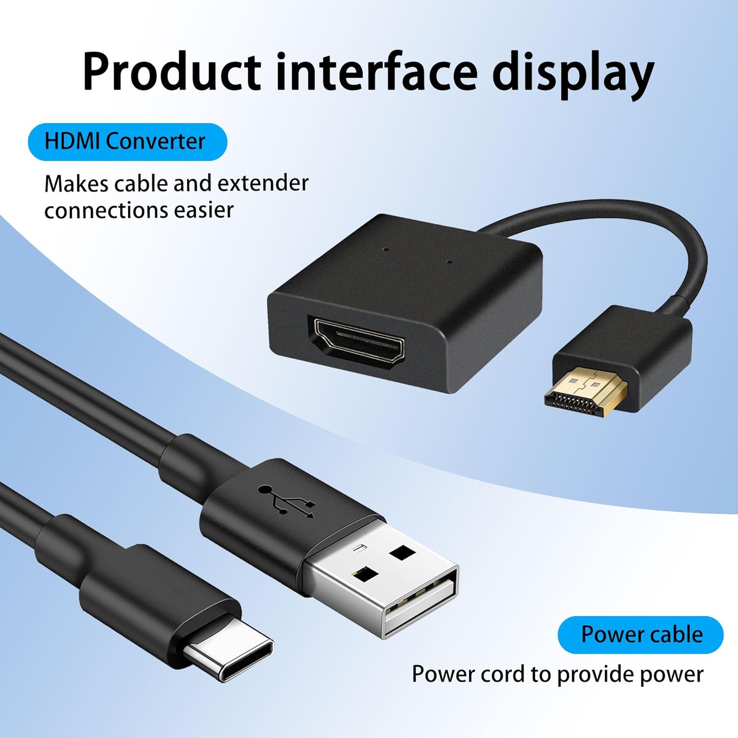 HDMI TO ETHERNET ADAPTER EASY TO INSTALLATION : Plugged the HDMI extender transmitter (TX) into my laptop HDMI. Plugged the HDMI extender receiver (RX) into the monitor HDMI. Plugged a Cat6 network cable between the TX and RX units.The HDMI extender transmitter has a USB port on the side and uses a 5v adapter to power the transmitter (TX).