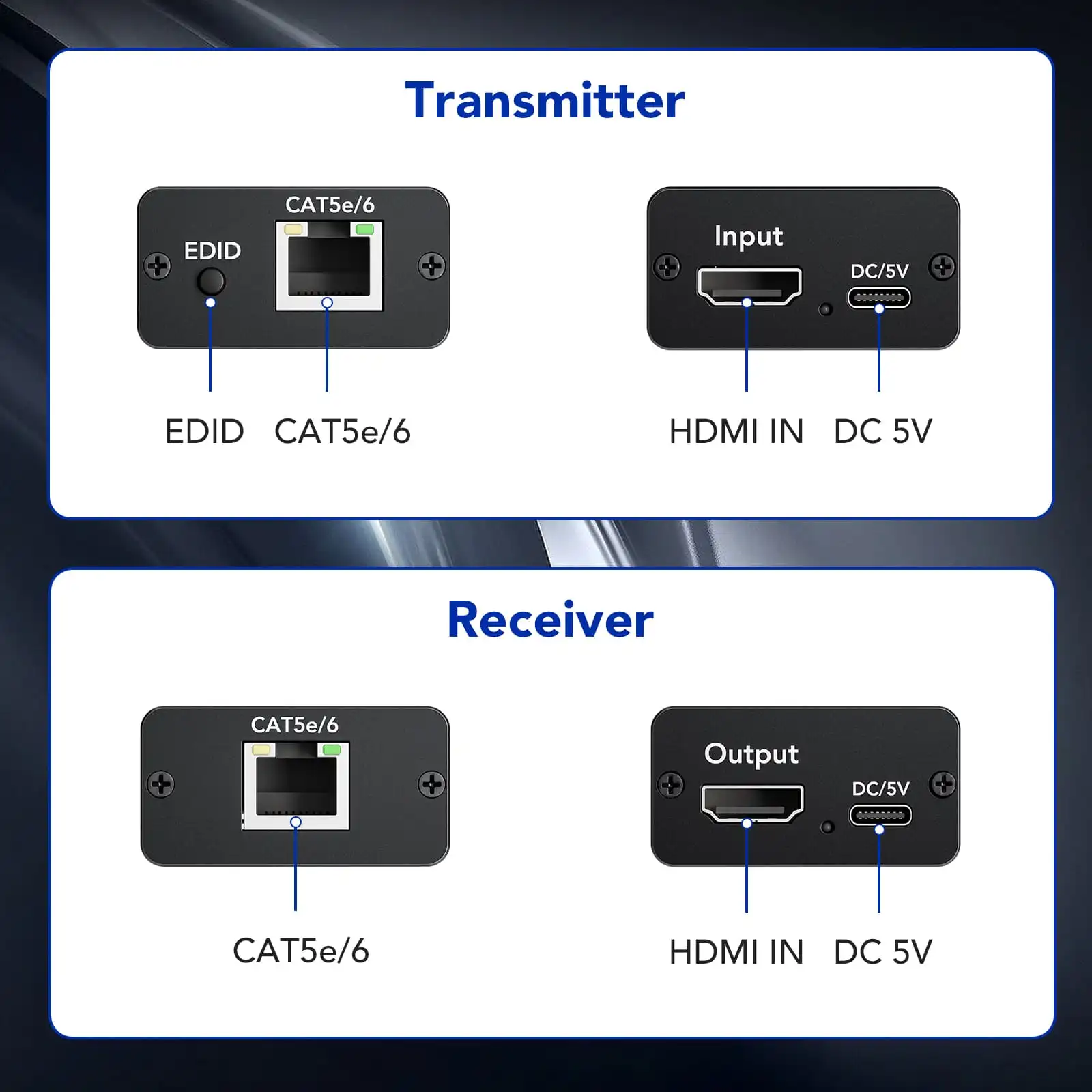 60M HDMI Extender: The RJ45 Ethernet extender can transmit HDMI 1080p signal to above 60 Meters/ 196ft by connecting Cat5e/6/7. Ideal for home, office, outdoor/ indoor scenes