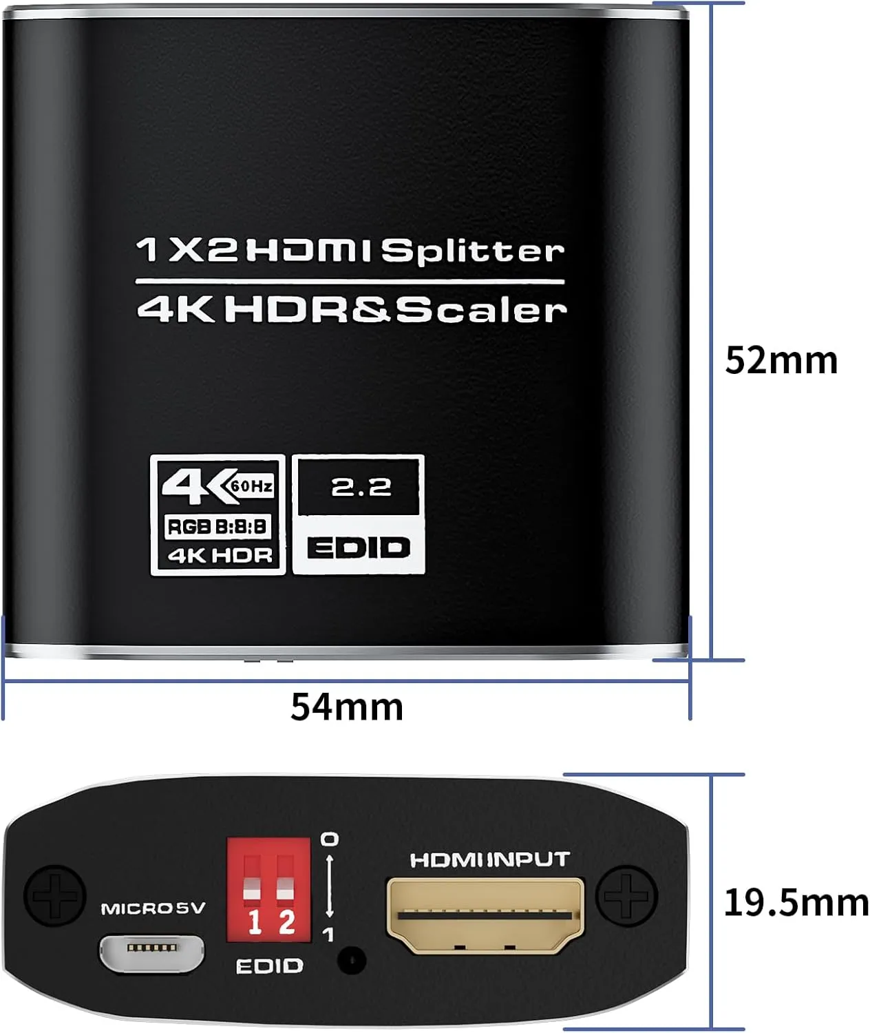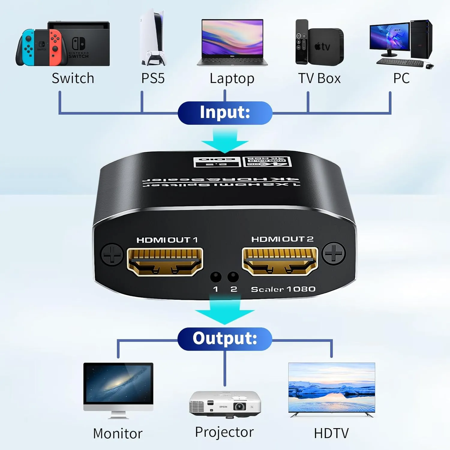 4K & 1080P Mixed Resolution: 2 way HDMI splitter supports ultra HD 3840x2160@60Hz, HDCP2.3, HDMI2.0b, HDR10+, 18.5Gbps frequency bandwidth, backward compatible with 1080i/ 720P/ 576P/ 576i/ 480P. Support auto video scaling/ downscaling function, can support mixed 4K@60Hz & 1080P@60Hz display outputs. Means a 4K video input source can simultaneously display 4K resolution to 4K monitor(s) and 1080p resolution to 1080p monitor(s) at the same time.