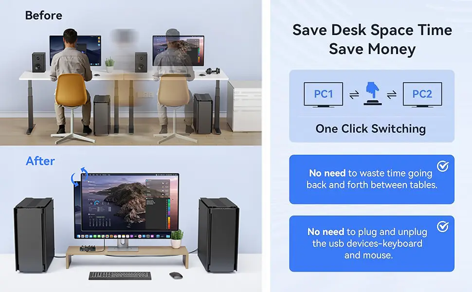 . * 【KVM Switch 2 In 1 Out】This KVM Switch 1 monitors 2 computers supports sharing a set of mouse keyboard printers and quickly switch between them with the push of a button, improving office efficiency and gaming experience.