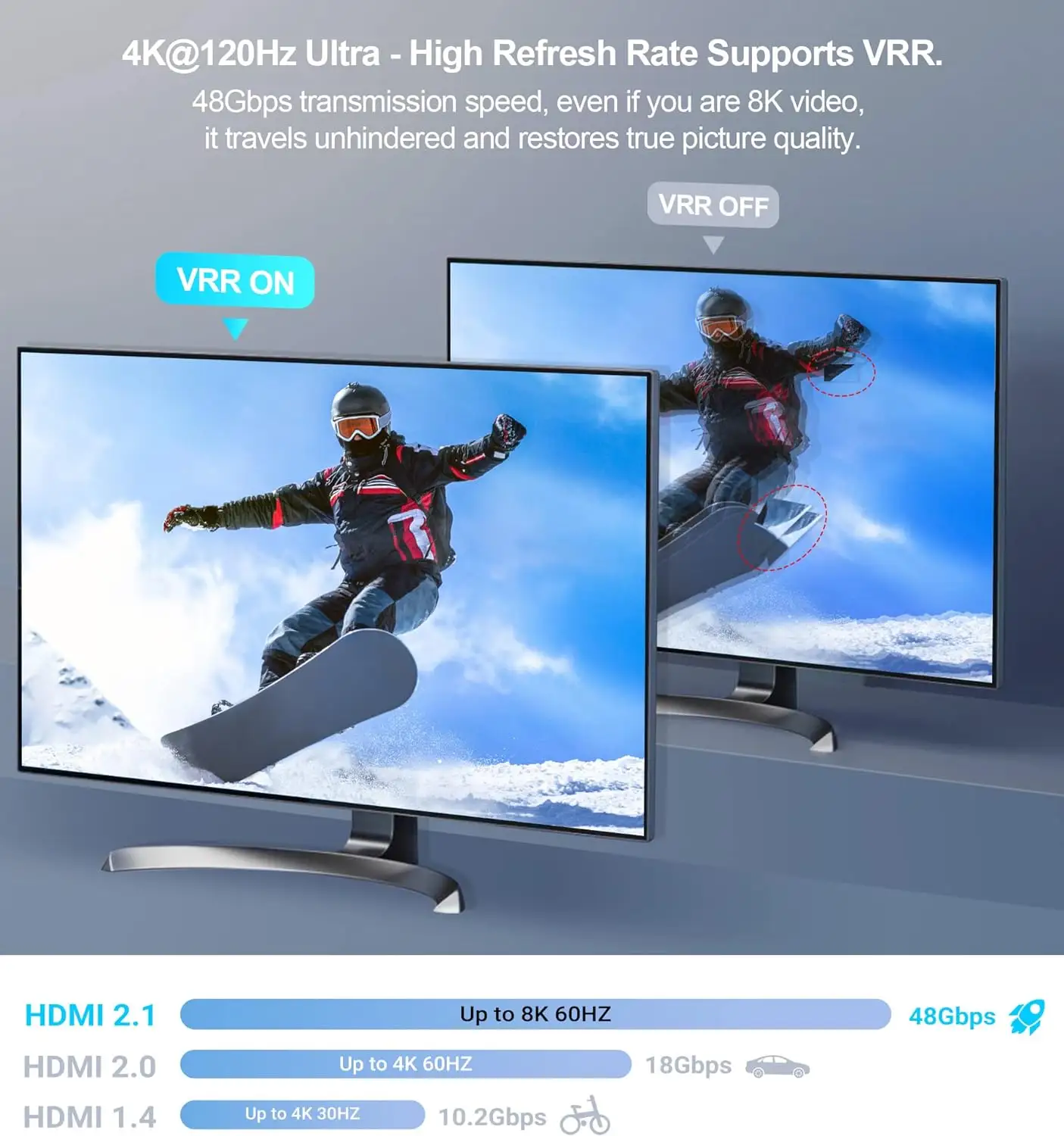 - HDMI 2.1 Switch 8K@60Hz: HDMI 2.1 switch supports 8K@60Hz, 4K@120Hz,1080P@240Hz, provides you with a transmission rate of up to 48Gbps and is backward compatible with all previous HDMI standards.High-speed and stable transmission of high-definition video signals with smooth and undistorted picture quality.Providing you a visual feast and ultra-high-quality gaming experience.