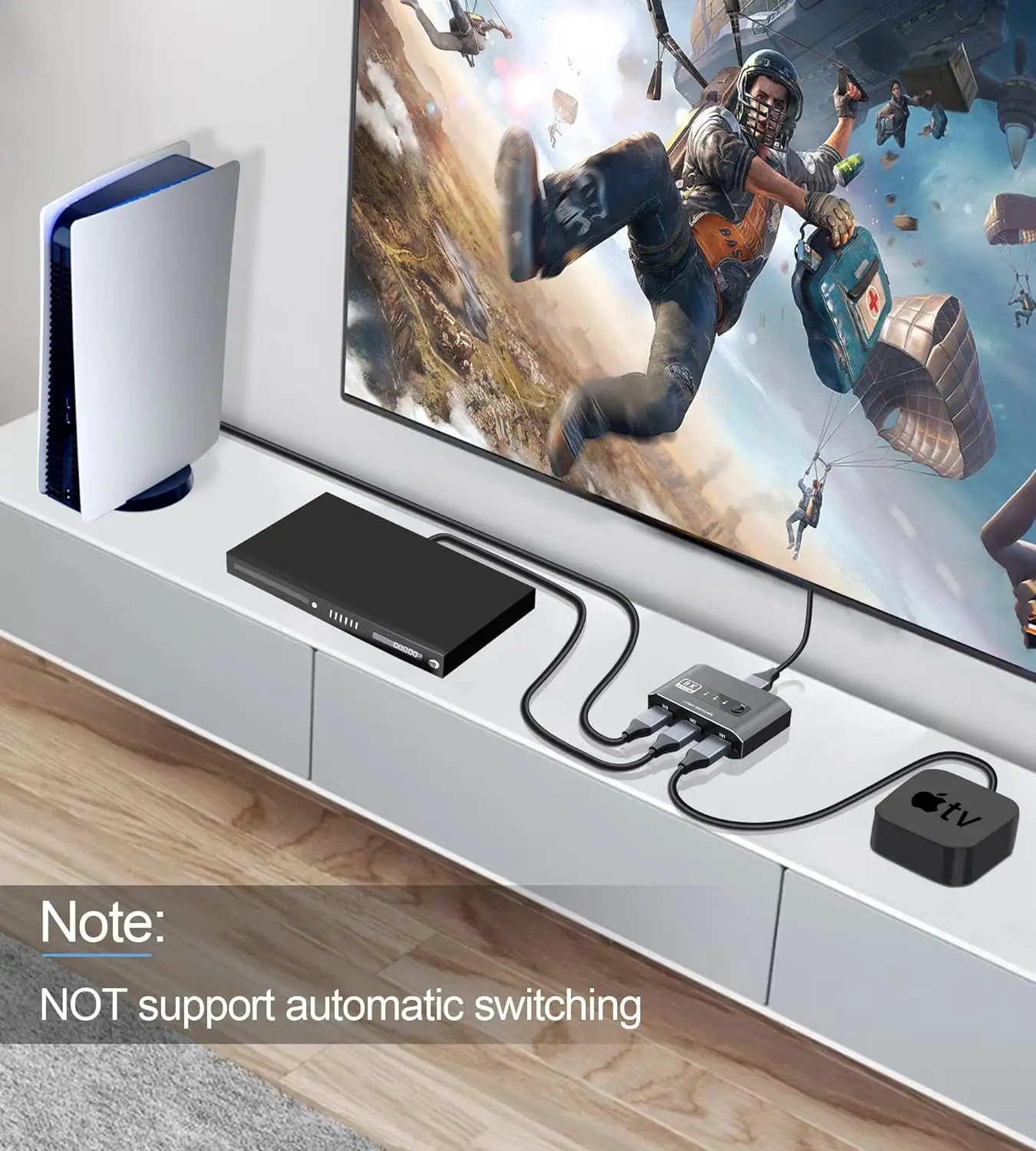 - Wide Compatibility: HDMI switch 3 port compatible with all HDMI 2.1 devices. Input: PS5, PS4, Roku, Fire TV, Blu-Ray, DVD, Xbox 360, Xbox One, Beamer, laptop compatible with Apple TV. Output: HD TV, Projectors, Monitor.