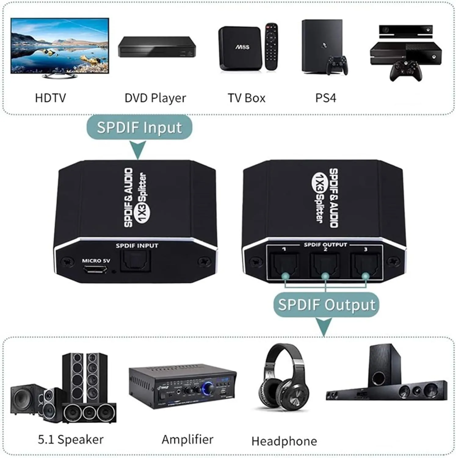 * Optical Switch 3 in 1 out: The optical audio Switch can connect 3 optical fiber signal input device (PS3, PS4, Xbox One,Blu-ray Player, Apple TV, , Cable Boxes etc.), then by fiber optic Switch output to 1 sets TosLink/ SPDIF siagnal receiving devices (Home Theater, Speaker, Amplifier, Soundbar, AV Receiver, etc.). Support of the last working status memory when switching off.