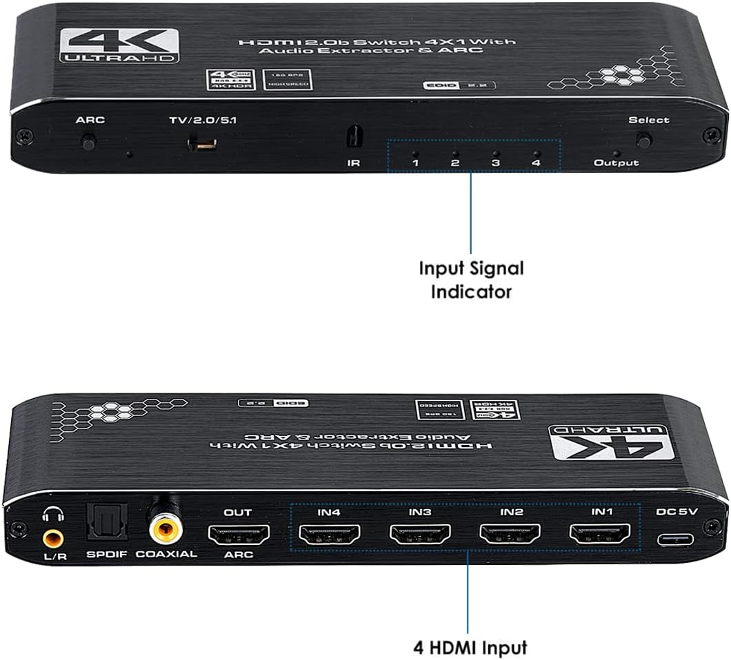 HDMI Audio Extract and Settable EDID: Supports LPCM/Dolby/DTS 5.1 channel and smart EDID management.Any input HD source can do audio extract by the SPDIF or 3.5mm headphone audio output port separately or at the same time.Built-in IR sensor comes with a handy, intuitive remote control that makes switching inputs,it can do also switch by press button. Note: AAA battery needed,and pls confirm your audio format is correct