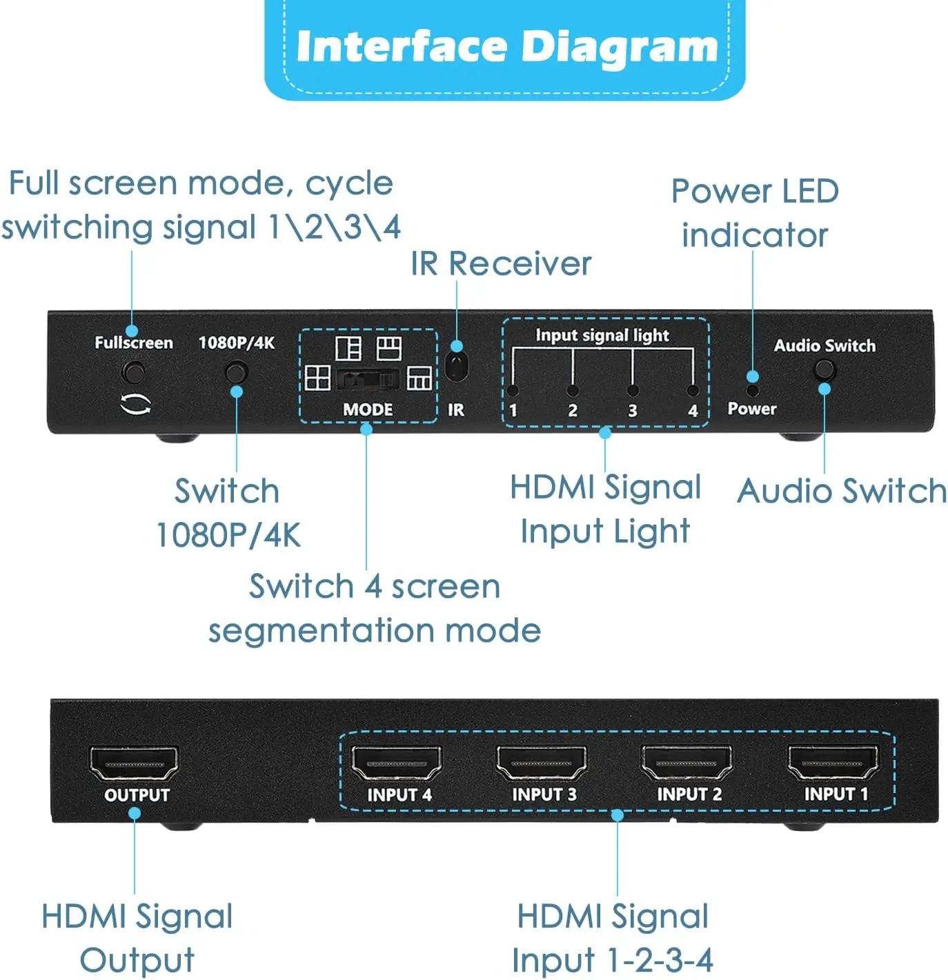 *【HDMI 4x1 Quad Multiviewer】This HDMI 4x1 Quad Multiviewer is a high-performance switch with four-channel HD screen segmentation and seamless switching output. The control methods of the switch is flexible, it can be switched via button and IR control. It is a very practical and stable switch that easy to install. It can be used in the major projects, meeting halls and other places.