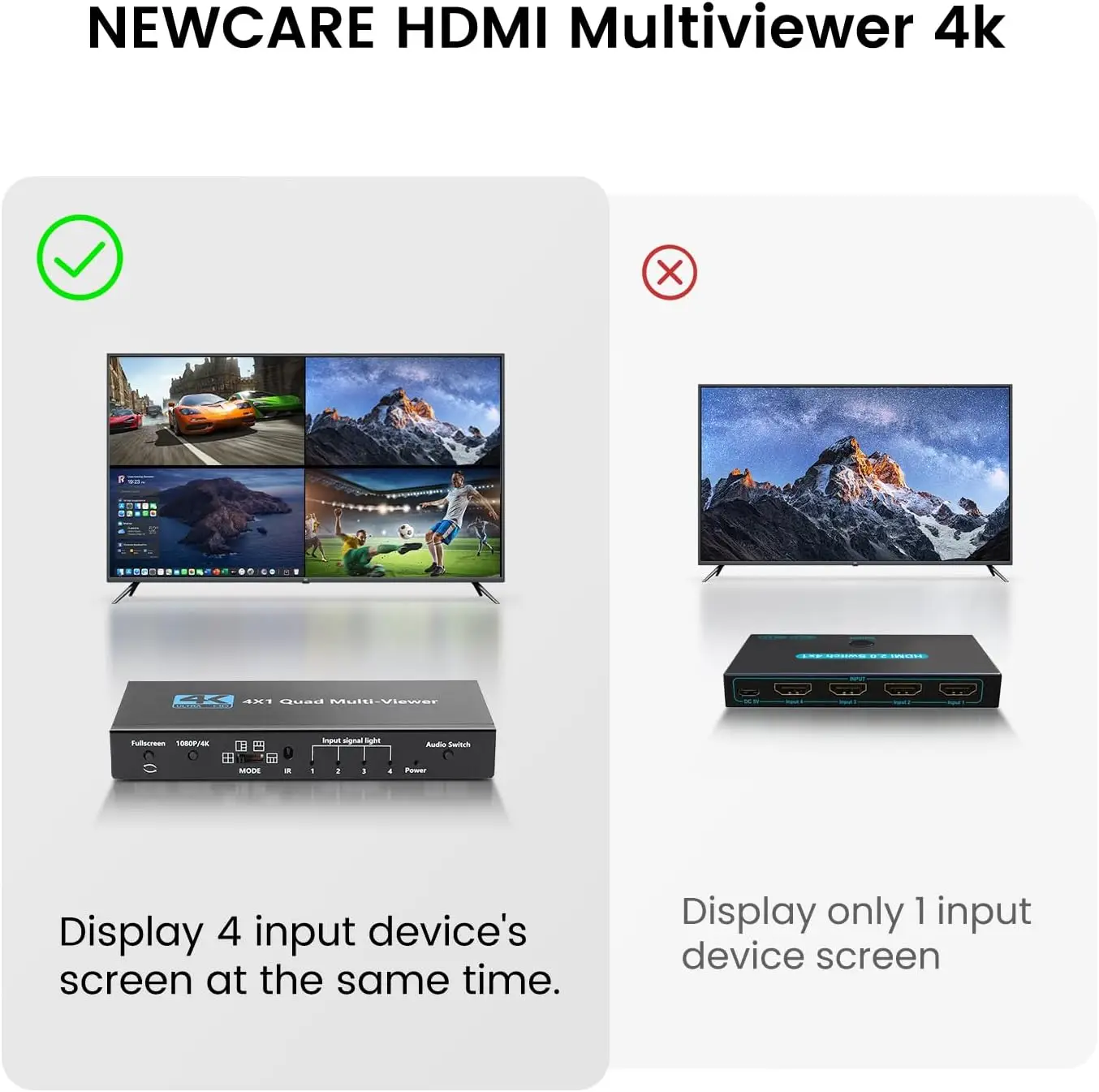 *【What you get】HDMI 4x1 Quad Multiviewer x 1, DC 5V/2A Power Adapter(TYPE-C port) x 1, Remote controller x 1, User Manual x 1. If you have any questions or concerns, please feel to contact us, we will give you a satisfactory answer within 24 hours.