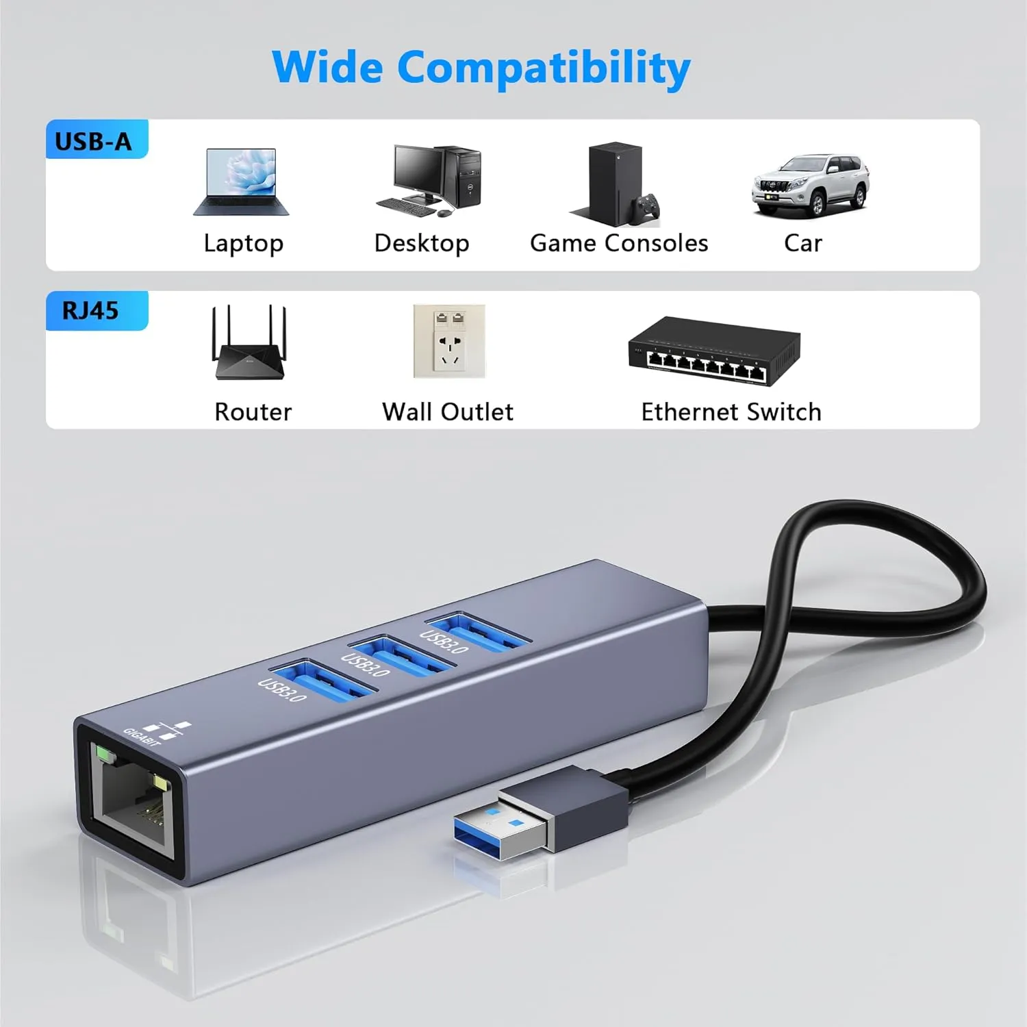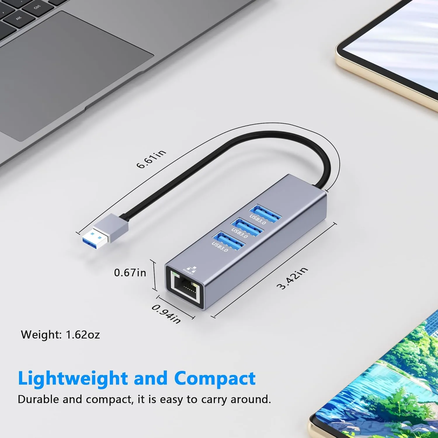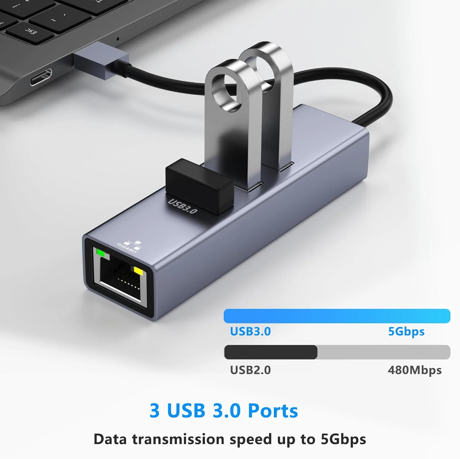 【Super Speed Data】With 3 USB 3.0 Hub port, this Ethernet adapter can provide a 5Gbps date transfer. You no need to take more time to wait for the upload or download. And you could insert your mouse, keypad and the USB flash drive via these hubs so that it could protect your device’s port from damage
