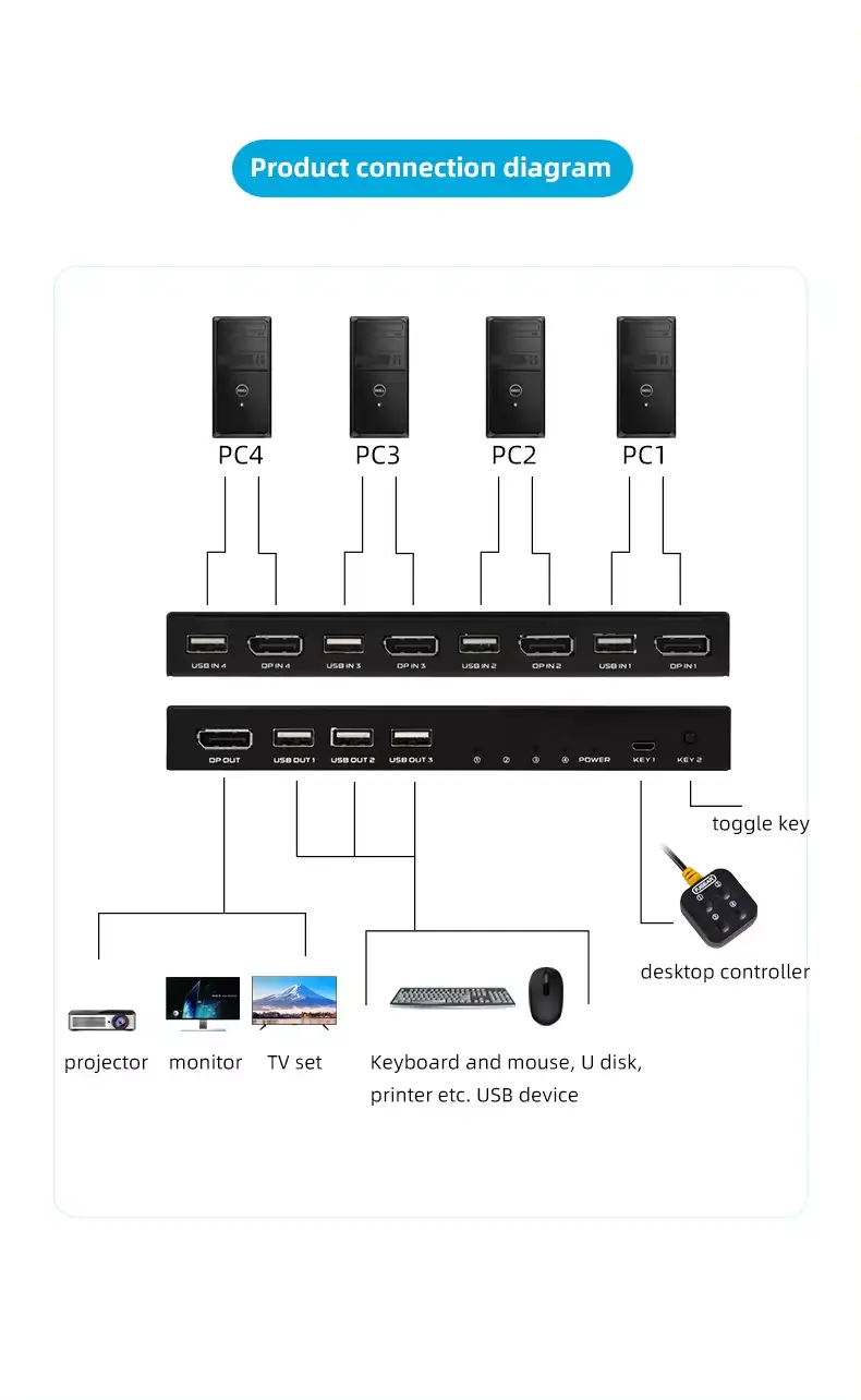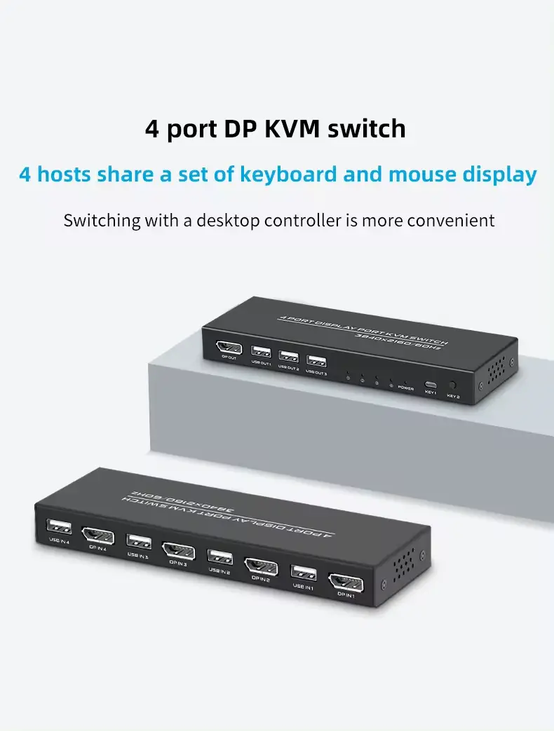 【4 Port DisplayPort KVM Switch】- DiamondTiger displayport KVM switch is a display port switch that can help you sharing one monitor and 3 USB 2.0 devices such as scanner mouse keyboard between four computers. One set of input equipments and one HD 4k@60Hz monitor to control all connected computers