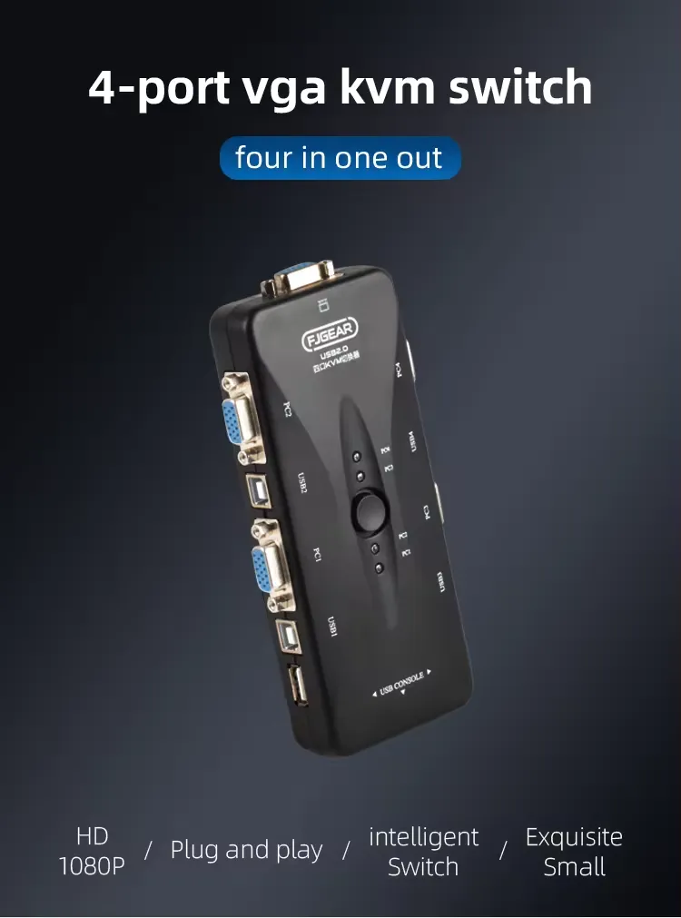 VGA USB KVM Switch - 4 Port VGA KVM Switcher allows to manage 2 computers or laptops with 1 monitor and 3 USB 2.0 devices, such as keyboard, mouse, printer, scanner and hard drives.