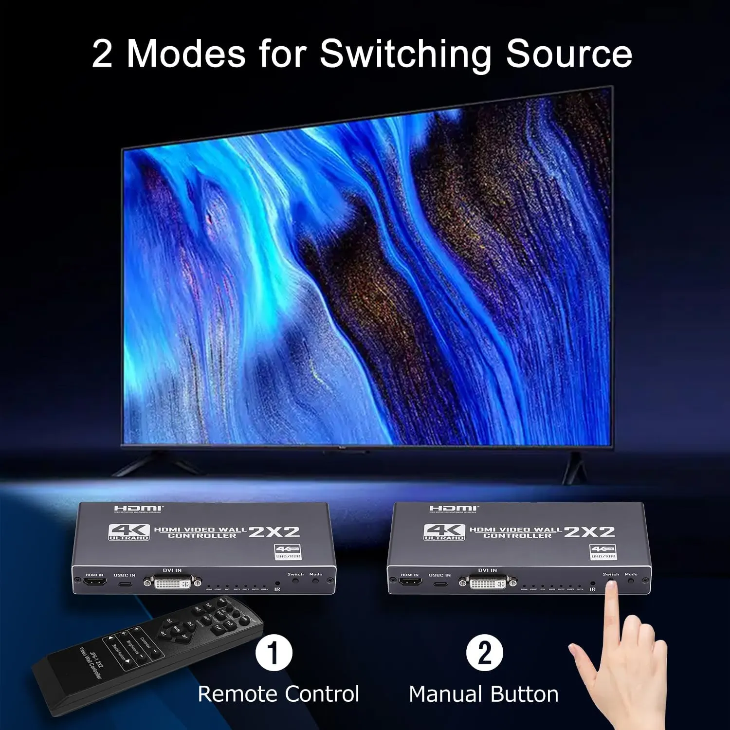 2x2 Video Wall Controller: The 4K 2X2 video wall controller, support 1-way HDMI/ DVI/ USB-C input and 4 HDMI output, function is to divide a complete HDMI, USB C, DVI output HD image singal into 4 blocks and assign to 4 video display unit (such as rear projection unit, LCD TV etc.). Complete with 4 HDMI high-definition video display units to form a large dynamic image screen.