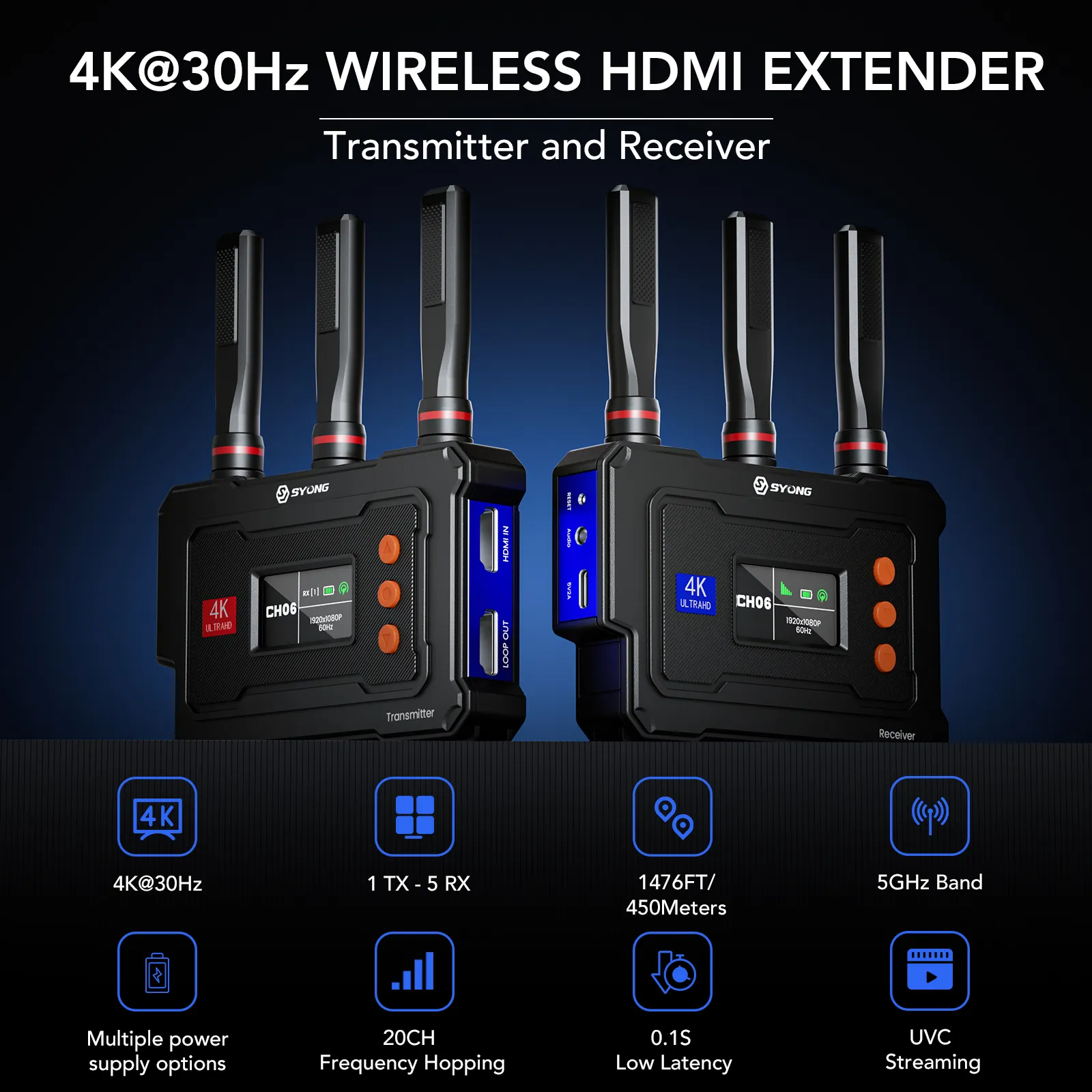 Vrriis Wireless Video Transmission System is a plug-and-play wireless HDMI kit designed for reliable long-range video delivery and flexible monitoring. It provides ultra-low 0.1s latency and up to 1500ft line-of-sight range in open, interference-free environments via dual-antenna 2.4G/5G point-to-point transmission (walls, metal, bricks, or glass may reduce range). With 20 adjustable channels and an LCD showing signal strength/interference, you can quickly choose the best channel on either TX or RX while the other end auto-syncs. The receiver supports USB-C UVC output for direct live streaming to a computer (e.g., OBS) using the included USB-C cable—no capture card required—while the transmitter offers HDMI loop-out for local monitoring. It supports HDCP 1.4 and up to 4K@30Hz, offers multiple power options (NP-F F970/F750/F550 or 5V2A USB-C/adapters, batteries not included), and supports 1TX to up to 5RX (more receivers will reduce transmission distance).