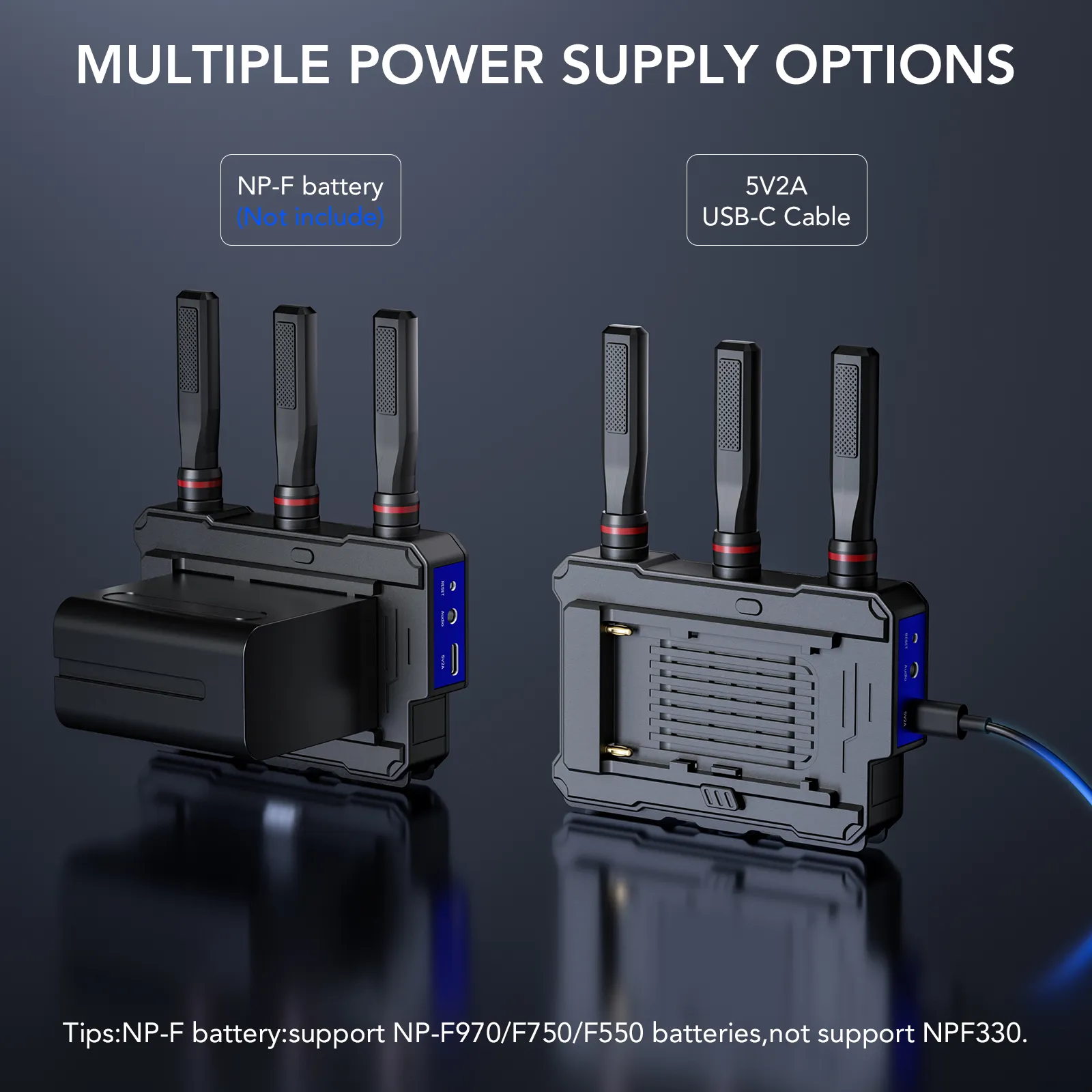 Power options include NP-F (F970/F750/F550), 5V2A USB-C/adapters, or 5V2A power banks (batteries not included).