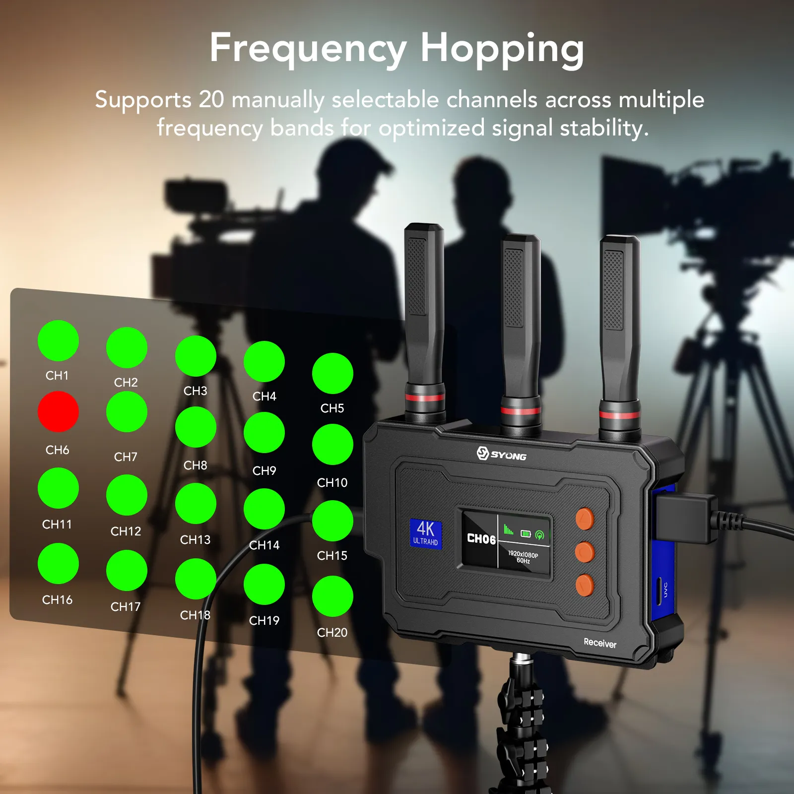 20 Adjustable Channels + LCD Display: LCD shows signal strength/interference per channel; manually select the best channel on TX or RX, and the other side auto-syncs for stable transmission.