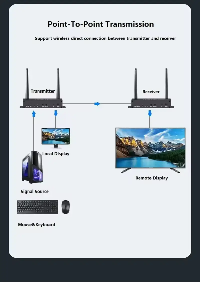 HDMI Wireless KVM USB Extender 656ft/200M: HDMI KVM USB Extender Balun: 4K@60Hz HDMI/ USB KVM extender can transmit high quality HDMI and 2 USB signals (keyboard and mouse)