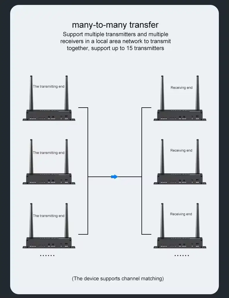 𝐔𝐩 𝐓𝐨 6𝐒𝐞𝐭𝐬 𝐈𝐧 𝐓𝐡𝐞 𝐒𝐚𝐦𝐞 𝐄𝐧𝐯𝐢𝐫𝐨𝐧𝐦𝐞𝐧𝐭: Connect up to 6 independent pairs of in the same environment without interference. By Cascading, it support building a network, supporting 6 pcs receiver or transmitter.