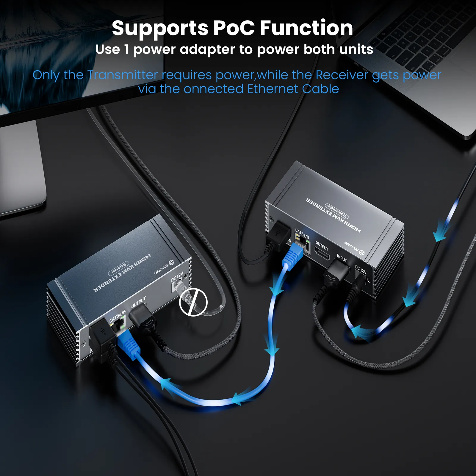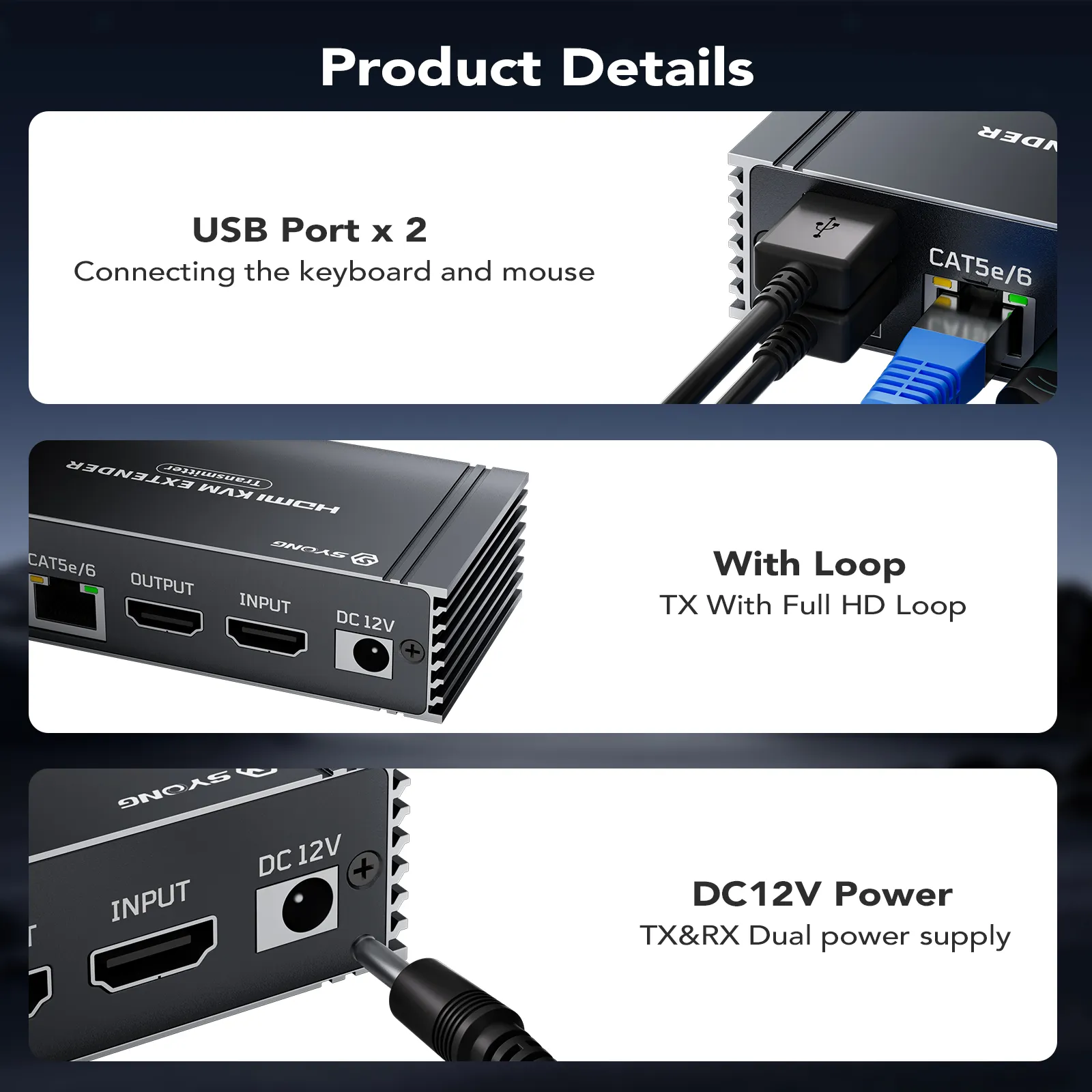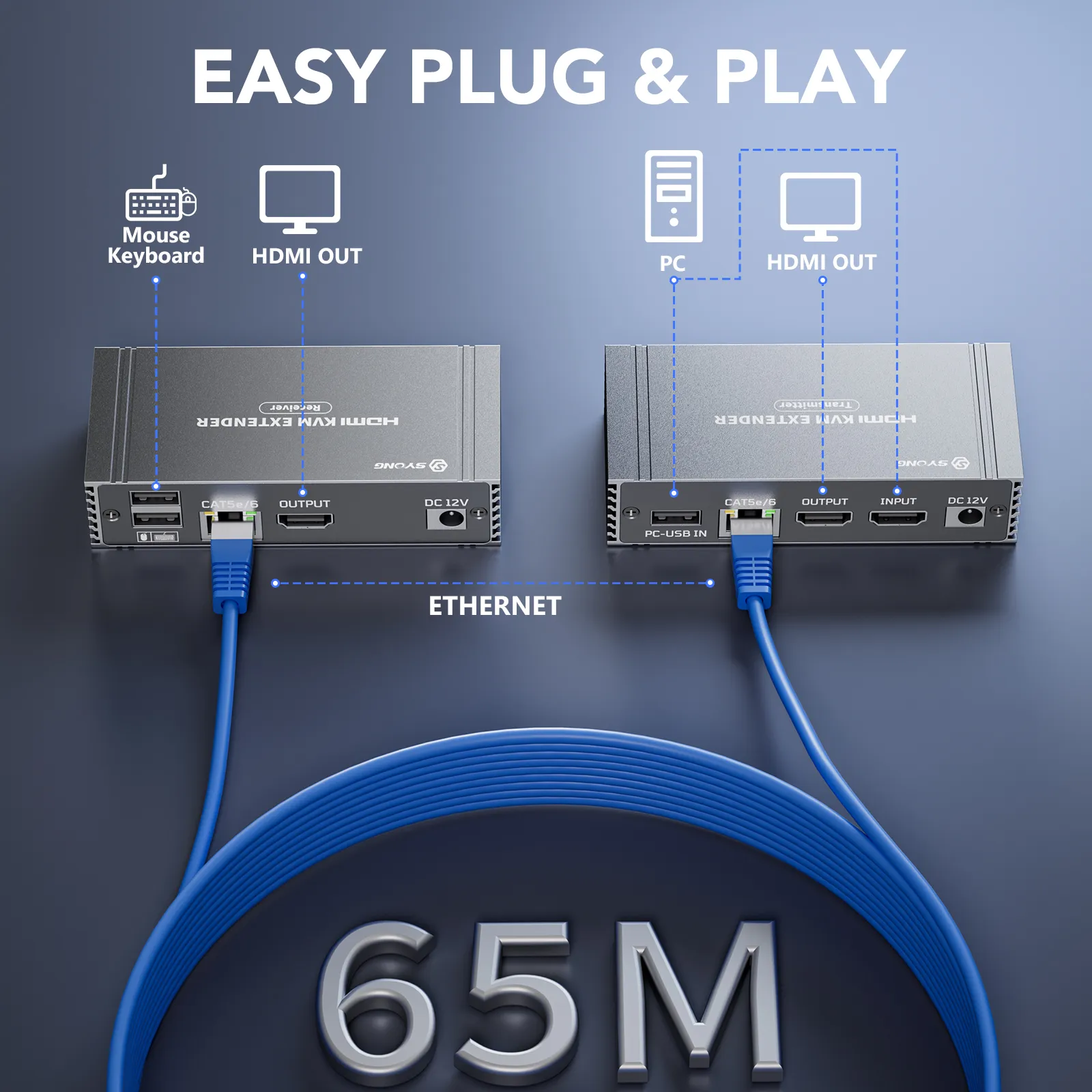 SYONG HDMI KVM USB Extender Balun transmits 4K@60Hz HDMI video/audio plus 2×USB (keyboard & mouse) up to 393ft/120m over a single CAT6 cable with zero latency and perfect A/V sync, and it also supports PoC (Power over Cable) for simplified installation.
