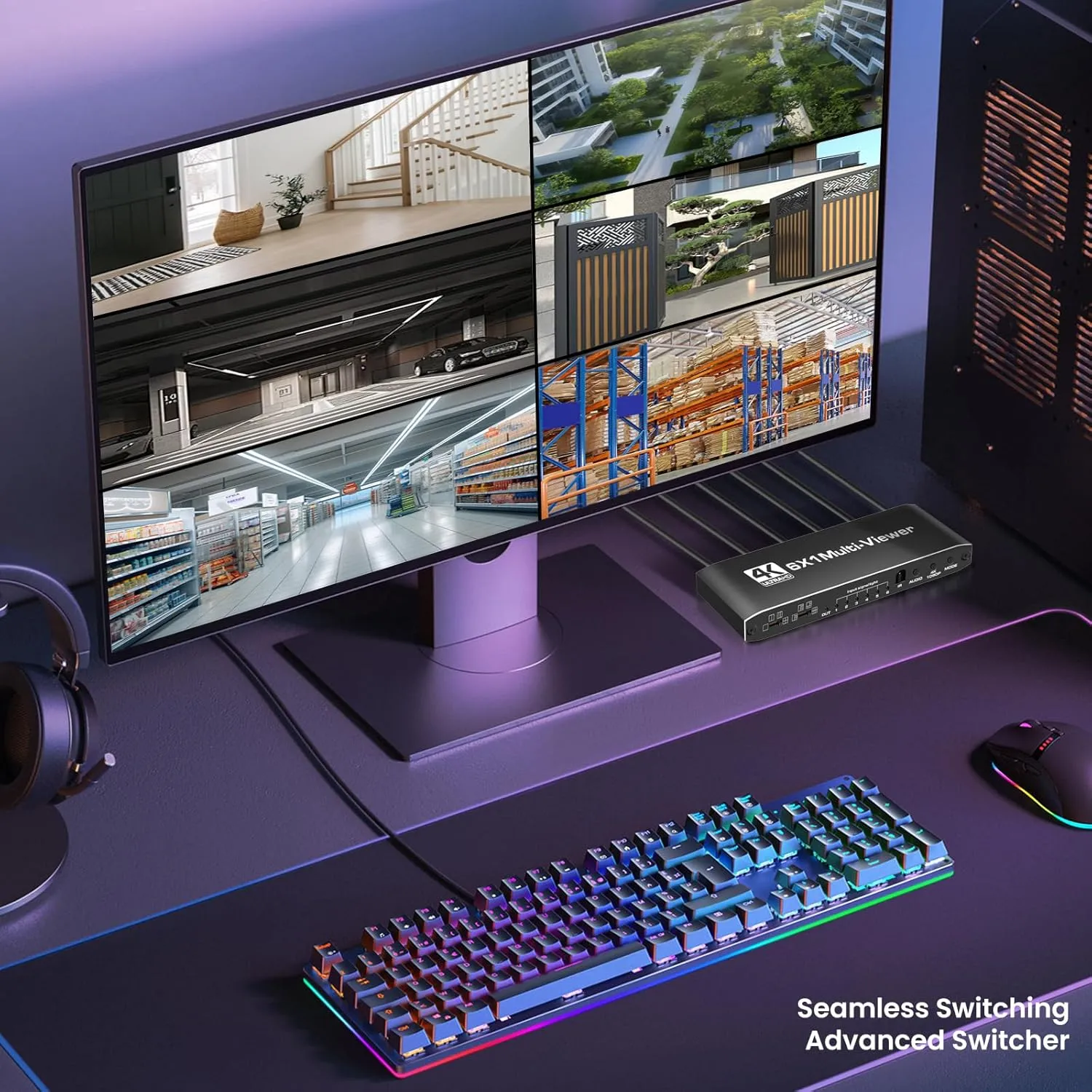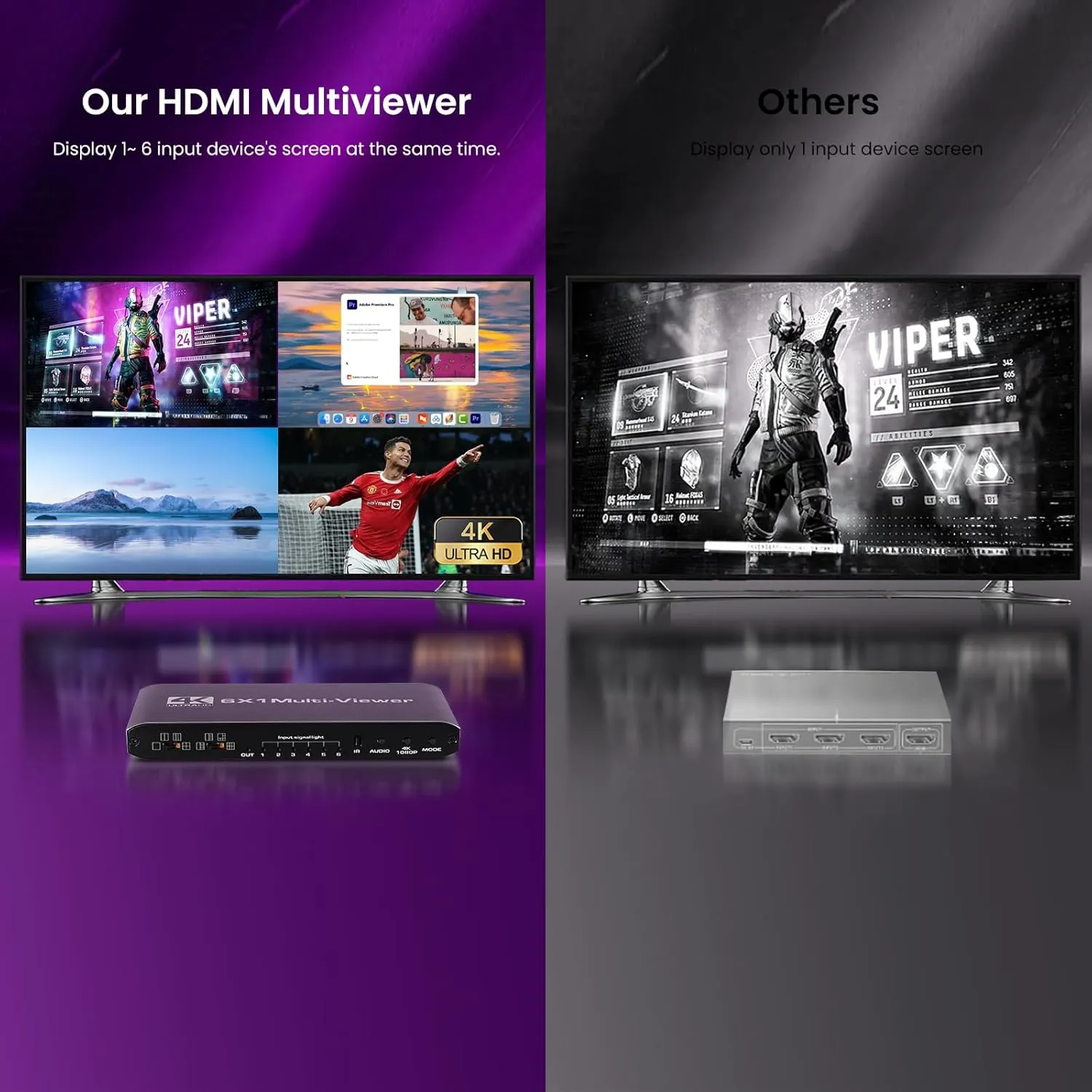 6×1 HDMI MultiViewer with 9 split modes, seamless switching (no black screen), up to 4K output with synced A/V, IR remote control, and plug-and-play compatibility for cameras/PCs/consoles to TVs/monitors/projectors.