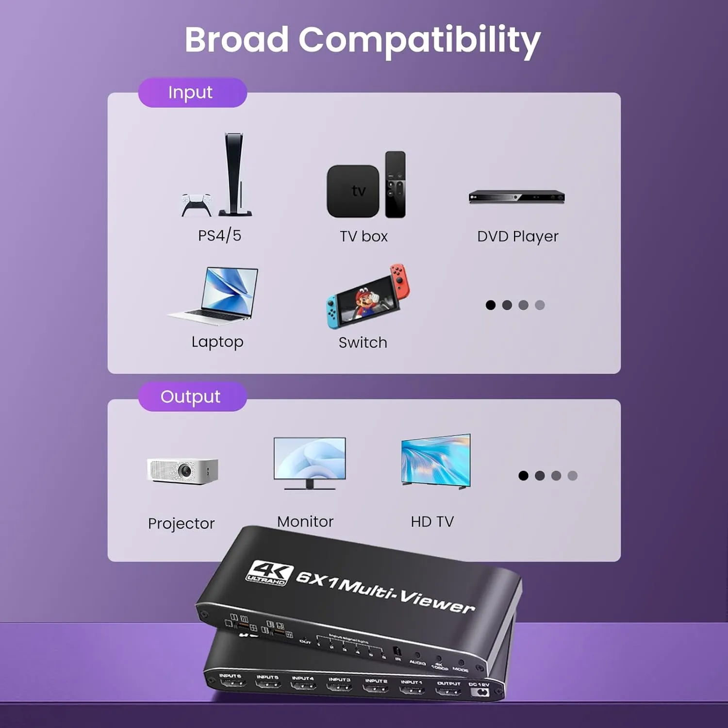 Seamless Switching Supports instant switching between 6 HDMI devices with no black screen or delay, ideal for full-screen operation.