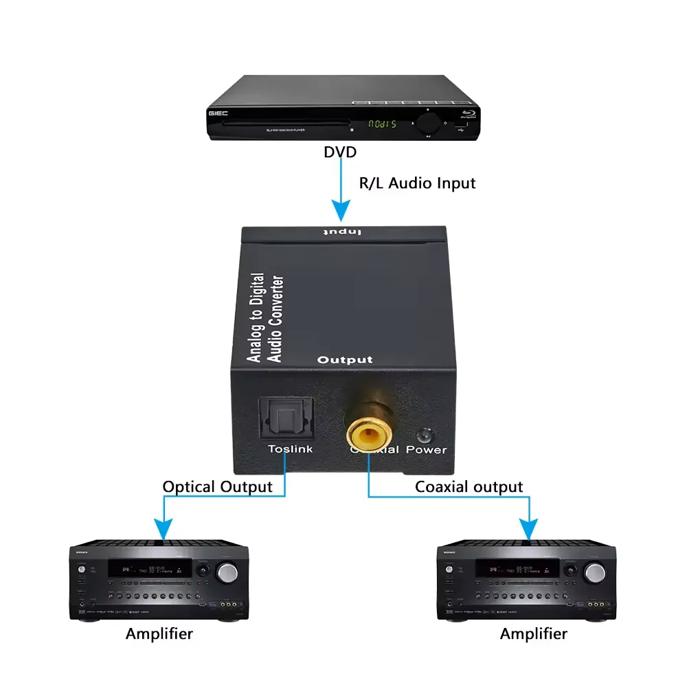 * 【Audio In and Out】Input Audio Connector: 1xToslink, 1xCoaxial (coaxial cable is not included); Output Audio Connector: 2 x RCA(R/L, RCA cable isn't included), 1x3.5mm Jack; Powered by 5V/1A Power Adapter.