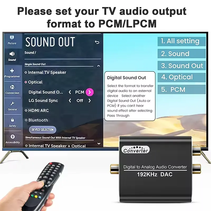 * 【Plug and Play】Simple installation and easy operation, needn't install extra driver. In addition, the DAC adapter comes with an optical cable and a power adapter for transmitting digital and providing power respectively, everything is arranged for you! (✅Please set PCM/LPCM audio format when using)