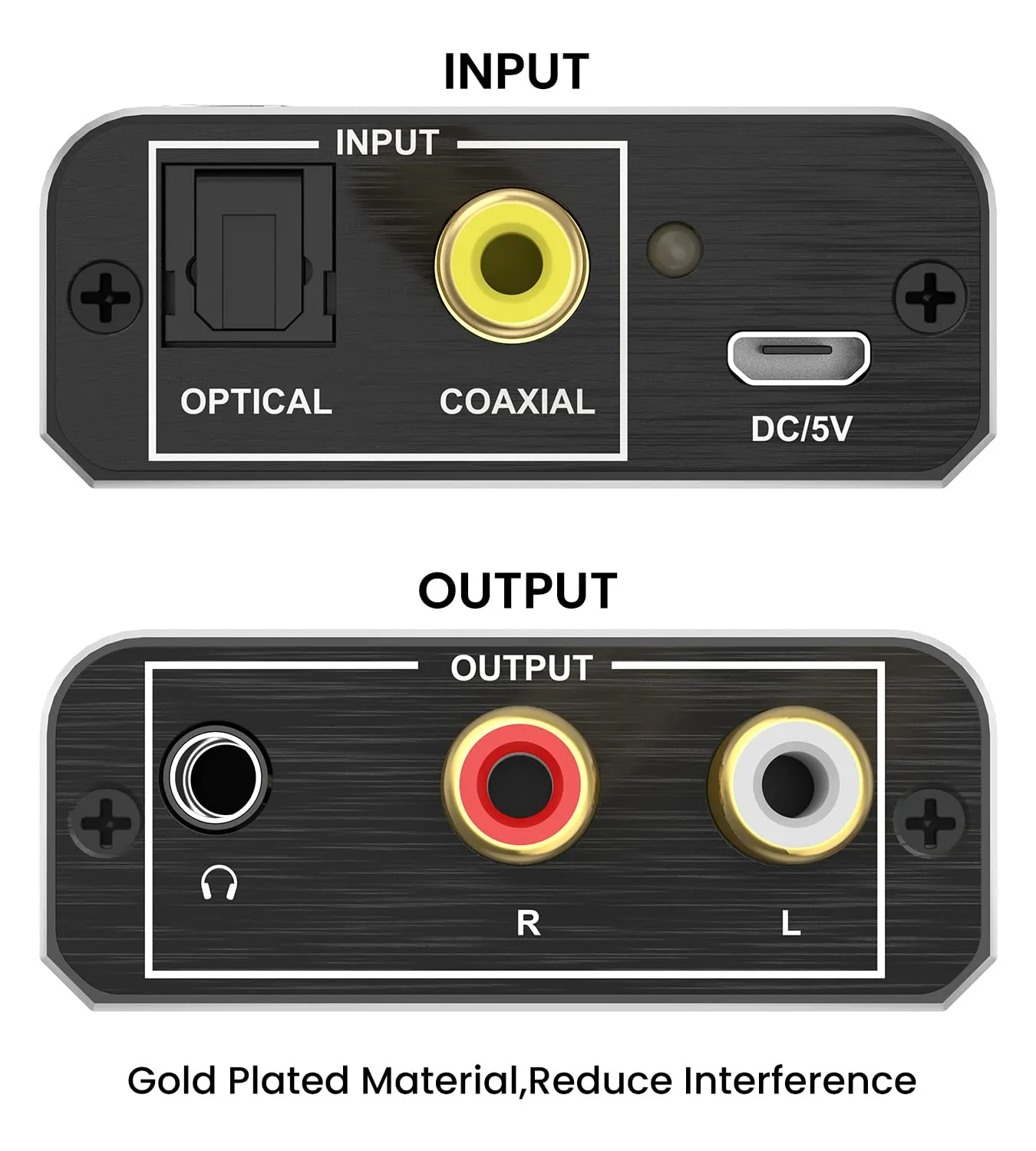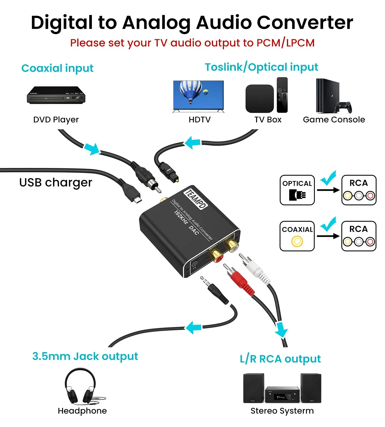 * 【Upgraded DAC Converter】Converts Coaxial or Toslink digital PCM/ LPCM audio signals to analog L/ R RCA and 3.5mm Jack audio, Can be Used for PS3, PS4, Xbox, Blu-ray Player, HD DVD, Home Cinema Systems, AV Amps, Etc