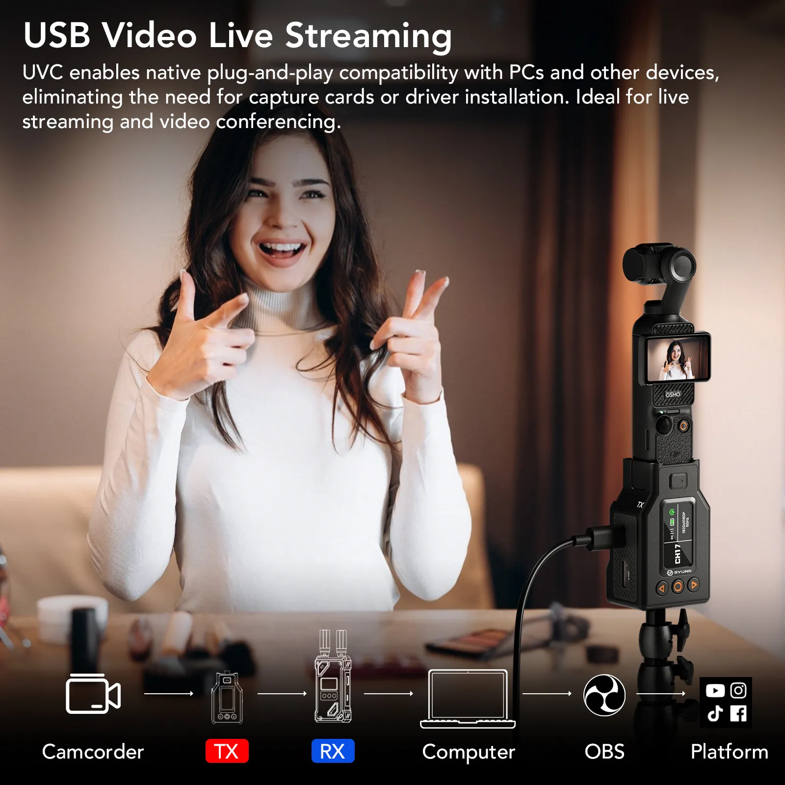 UVC Live Streaming Compatible with OBS Receiver features UVC output for direct computer connection as HD camera Supports 1080P 60Hz live output and works with OBS and mainstream streaming software suitable for filming live streaming conferences and teaching