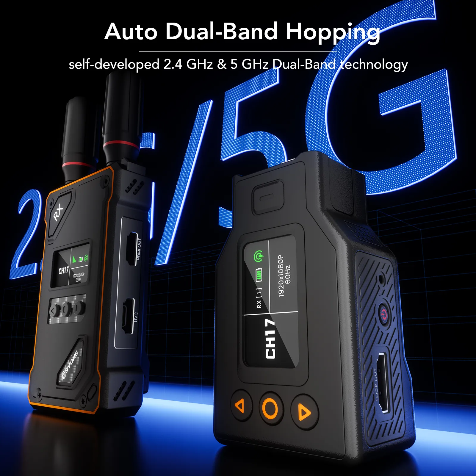 5GHz 20 Channel Anti Interference with LCD Monitoring Operates on 5GHz band with 20 manually selectable anti interference channels supporting independent channel switching on both transmitter and receiver Built in LCD displays provide real time monitoring of connection status signal strength channel selection and resolution information