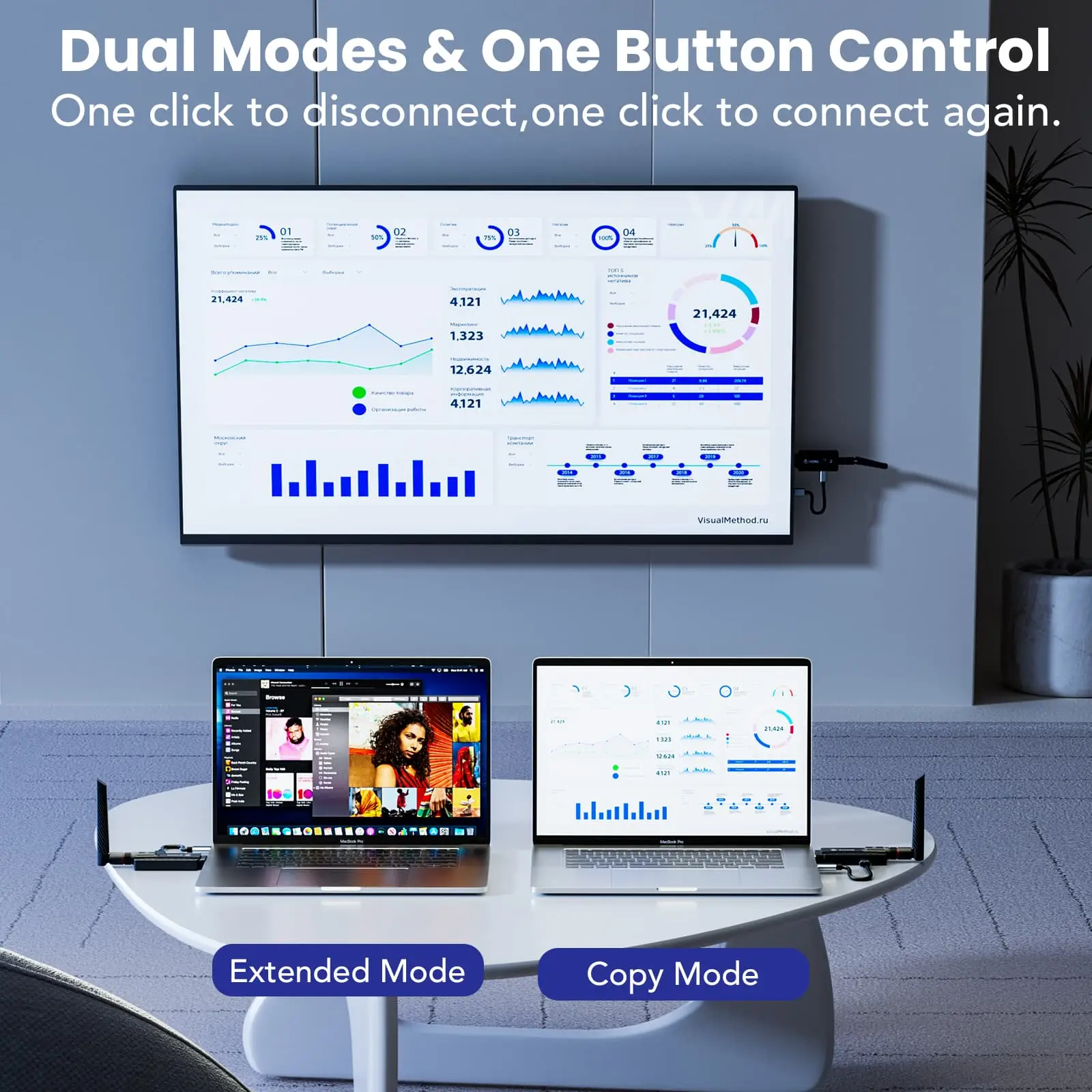 This new upgrade wireless HDMI sender and receiver seamlessly streams video and audio to two displays in open environments, connecting multiple TVs with an impressive range of up to 200 meters. It offers Mirror (Copy) and Extended modes for home theater, meetings, and multitasking, provides ultra-low latency ≤0.06s for gaming and live use