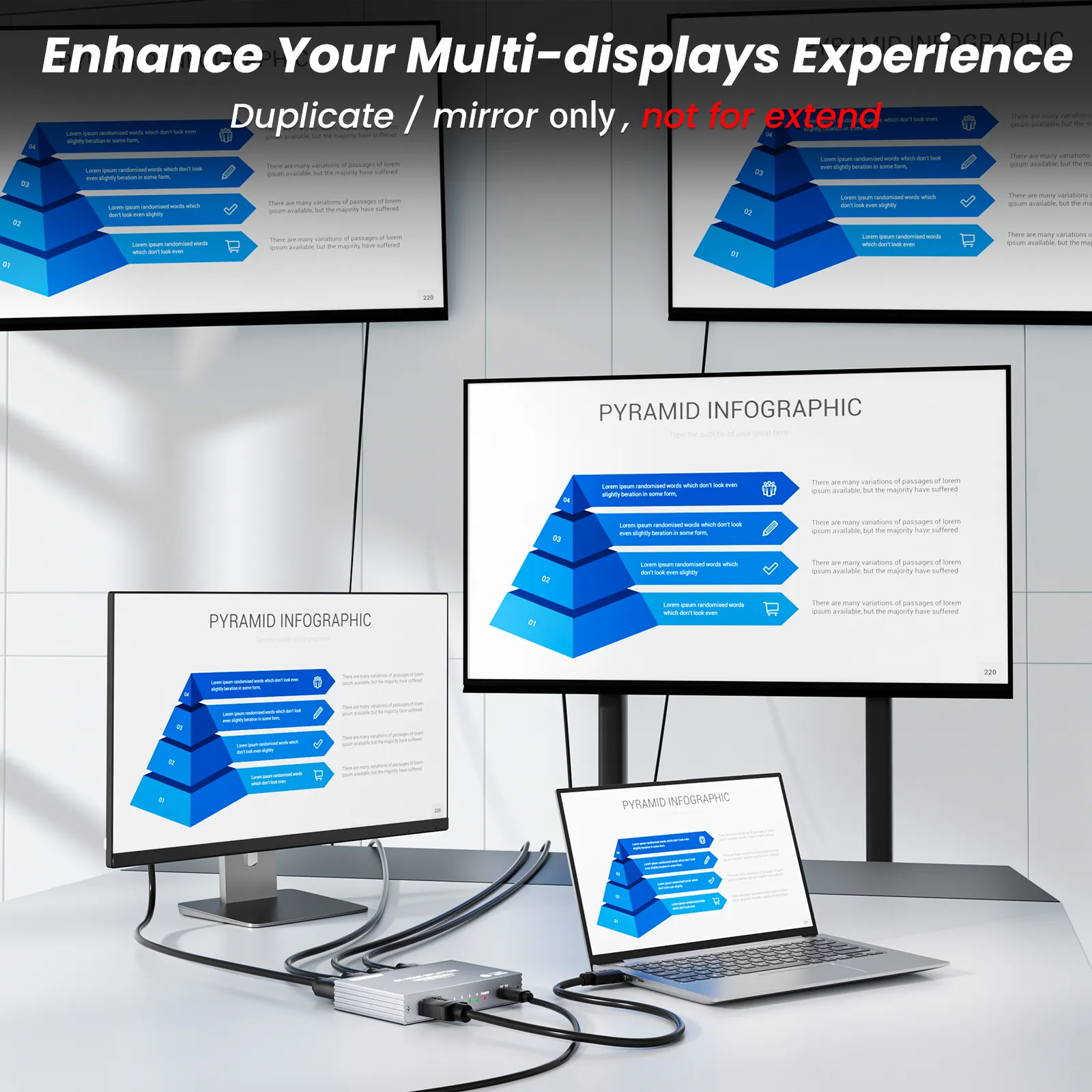 HDMI Splitter 1 In 4 Out: Duplicates one HDMI input to two identical HDMI outputs simultaneously (mirror mode only, not extended display).