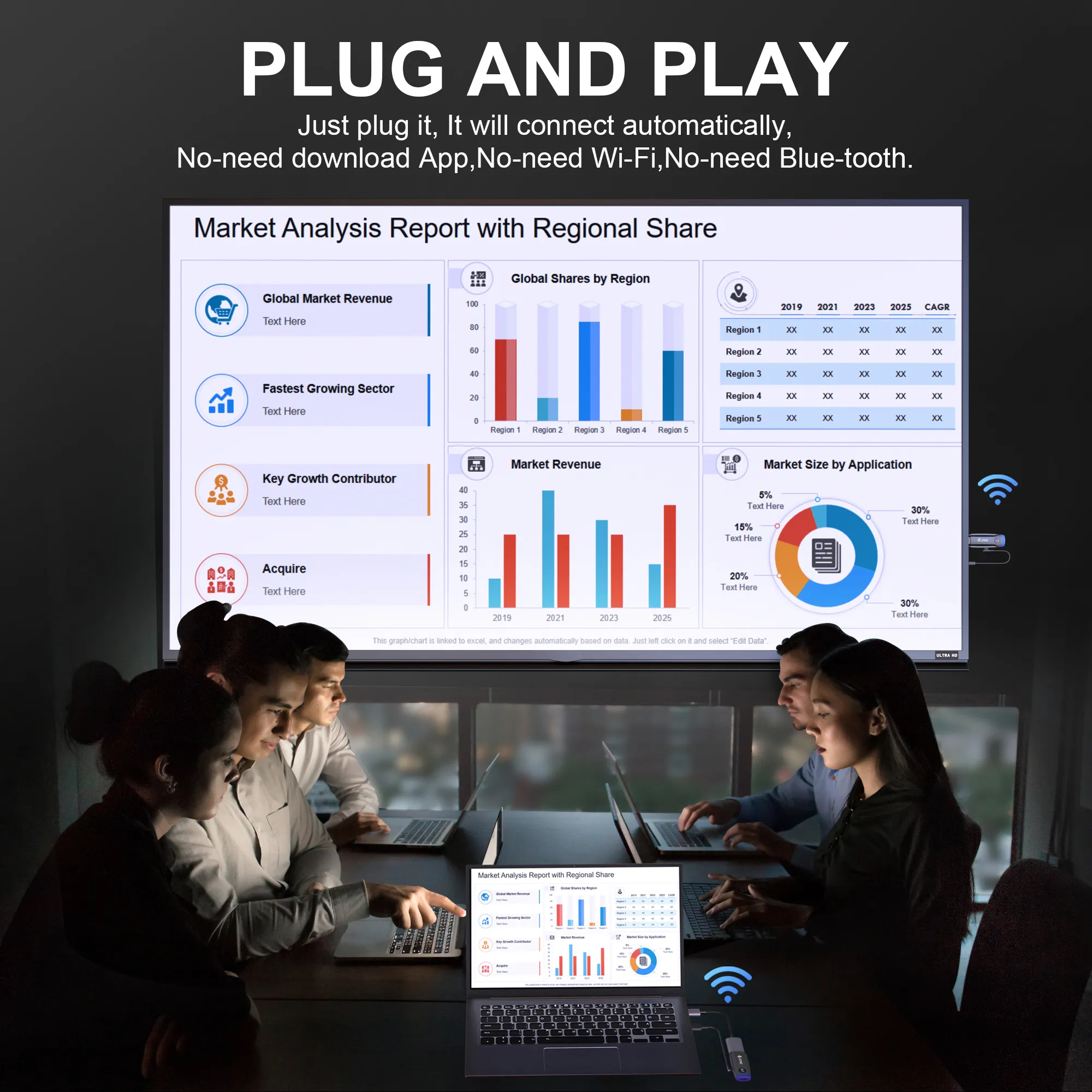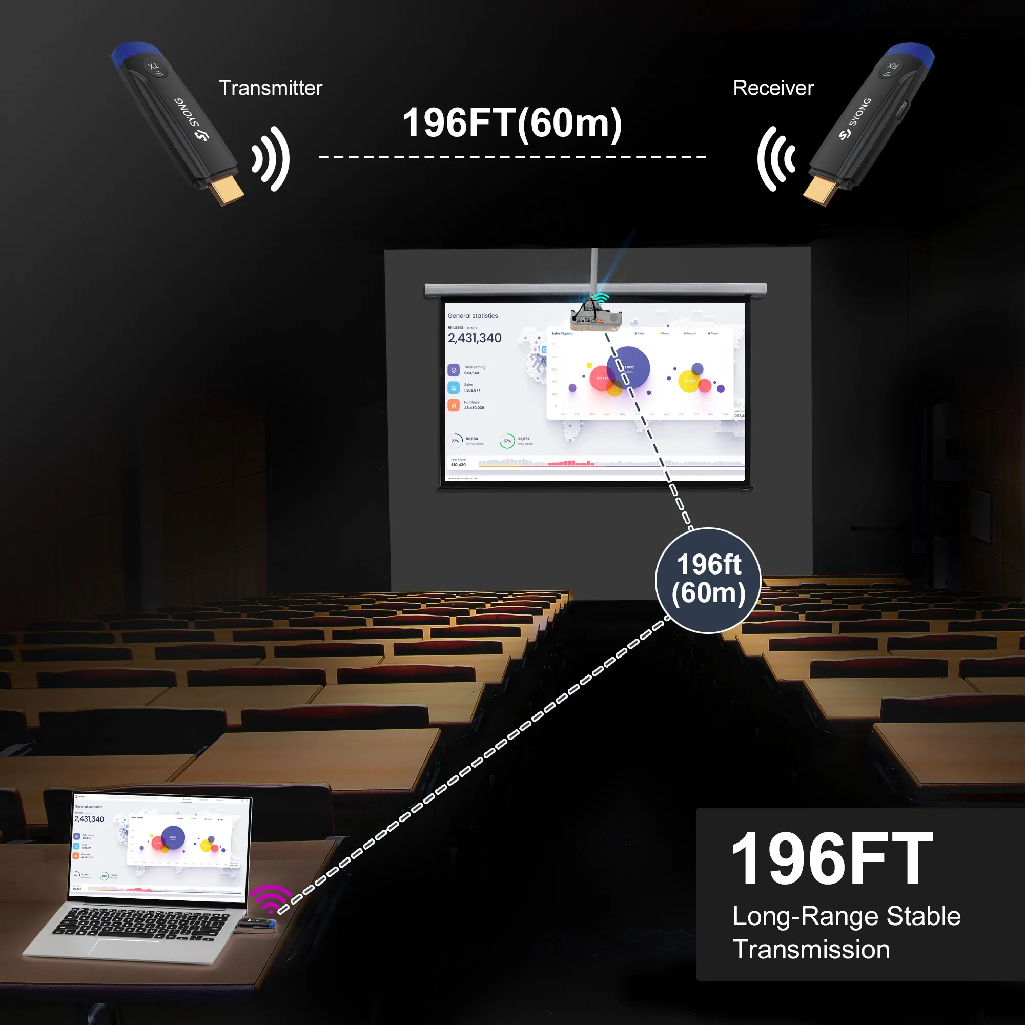 The SYONG Wireless HDMI Transmitter and Receiver 4K brings effortless screen sharing to any space. With true 1080P@60Hz quality, 0.05s low latency, and dual-band 2.4G/5G transmission up to 60 m (196 ft), it delivers stable, high-definition audio and video without Wi-Fi, apps, or drivers. One receiver can pair with up to four transmitters, allowing smooth one-click switching between laptops during meetings—perfect for collaborative presentations, classrooms, and home theaters.