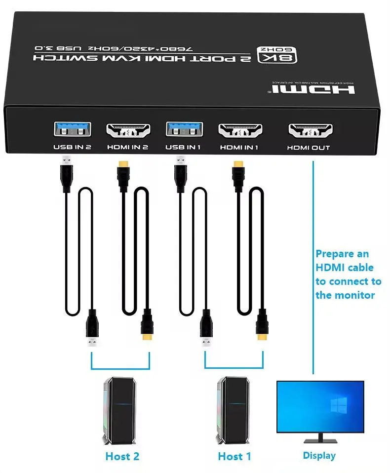 * 【KVM Switch 1 Monitor 2 Computers】This KVM Switch allows 2 computers to share one Monitor and 5 USB 3.0 devices such as a set of keyboard, mouse, hard drives, U disk, and printer, and centralize control of your 2 computers on one monitor. You can easily switch between two hosts, which not only keeps your workspace tidy but also helps to maximize productivity. [NOTE: Must Connect two USB A to C cables for better Power Supply and data transfer.
