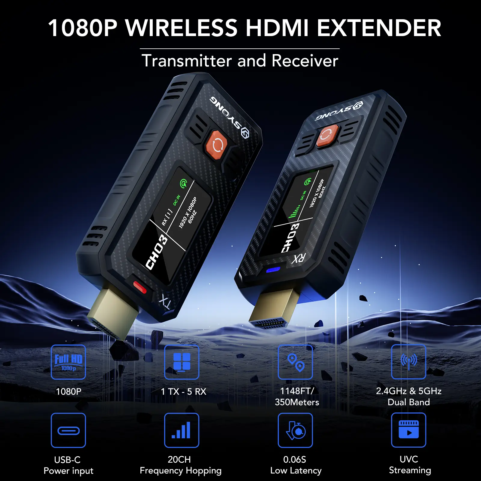 1080P 350M/1148ft WIRELESS HDMI™ Transmitter and Receiver support Auto-sync Channels and 1-to-4