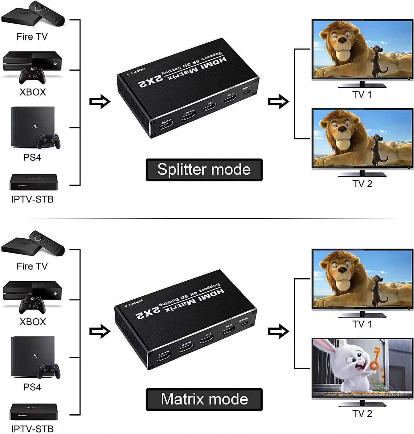 HDMI Matrix Switch 2 in 2 Out Switcher Splitter Box with IR Remote Control