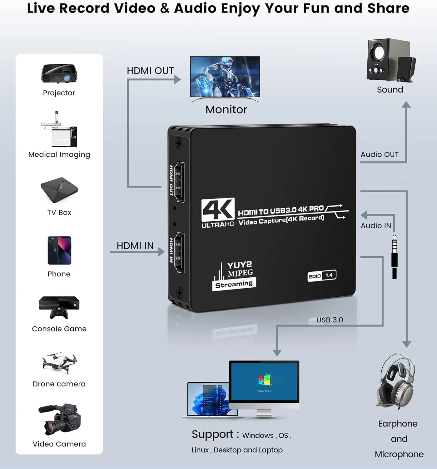 4K60Hz HDMI USB3.2 Capture card Support 2K 144Fps, 1080P 240FPS